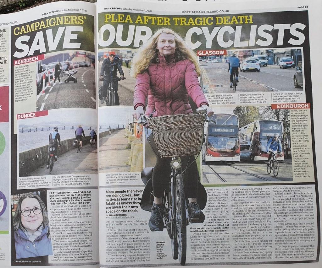 I’m in The Scottish Daily Record today in an article about the state of cycling in Scotland. This is in response to the tragic death of a young woman in Edinburgh this week. It’s a good article that got a full double page spread and my photo spans from top to bottom of the paper!