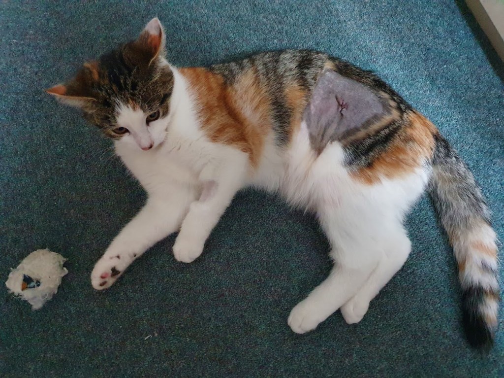 Poor Victoria was spayed this week. I felt so mean, first starving her overnight and then putting her through a hysterectomy for no fault of her own. I very nearly cancelled the whole operation but I know it’s the right thing to do. She has recovered so quickly and was leaping about the house again within hours of coming home. It’s quite amazing how quickly she’s recovered. It’s a small wound on her flank.
