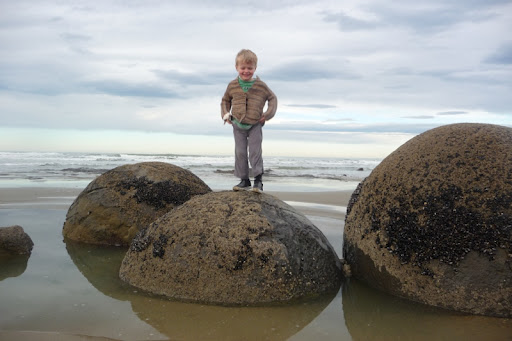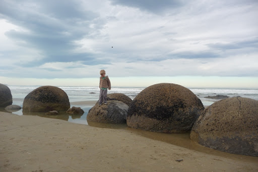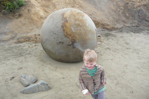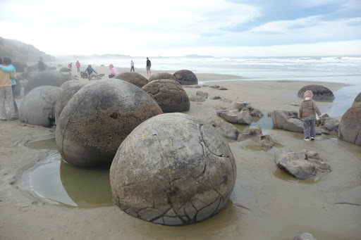 About an hour north of Dunedin is a lovely little spot on the coast called Moeraki. It’s not the beach that draws the tourists though, it’s the rocks, otherwise known as the Moeraki Boulders. They are a weird assortment of spherical rocks sitting on the beach. No-where else in New Zealand has formations like these. Geologists have a somewhat boring explanation for their existence, so Daniel and I decided upon a more exciting theory: they’re dinosaur eggs. Behold the Moeraki eggs: