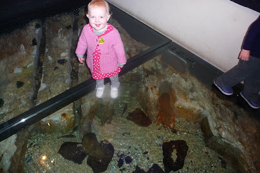 | Elizabeth standing on a glass floor suspended over live fish and a lobster |