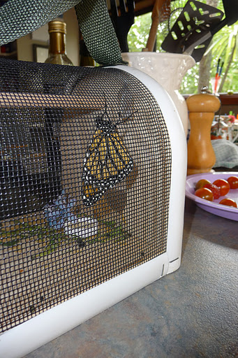 The butterfly has emerged at last! Our little caterpillar built his chrysalis just over two weeks ago and has been inside until yesterday. We noticed the chrysalis getting darker over the past two days and then yesterday we started to see some orange.
