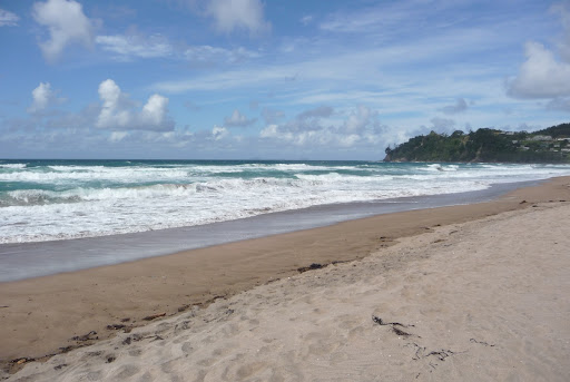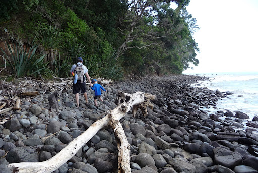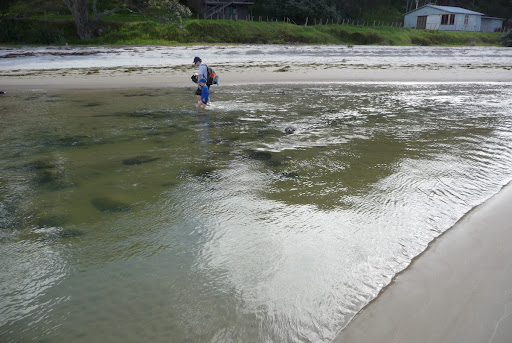 The beach we visited on Saturday afternoon is called New Chums beach and was rated by The Observer as one of the top 20 best deserted beaches in the world. It is not accessible by car and can only be reached via an obstacle course of wading through a lagoon, clambering over rocks and trekking through jungle. We set out on foot as a party of 6 including a two-year-old, a five-year-old, an ageing poodle and Granny as well as myself and Ben.