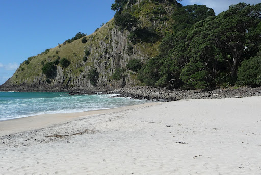 The beach itself was very nice. Picture a carpet of soft, white sand against a shoreline of Pohutukawa trees and an expanse of blue-green water. There is some interesting geology in the nearby cliffs and a couple of mysterious islands in the sea. The jungle part of the walk is lined with Nikau palms.