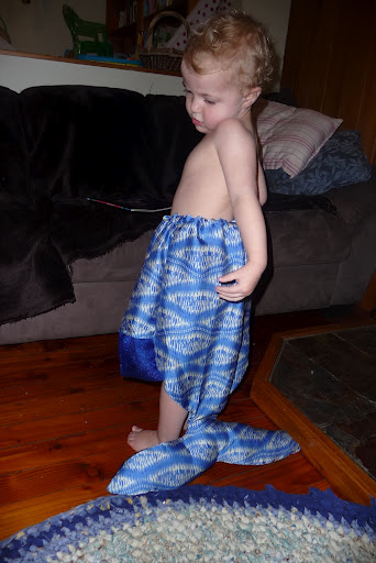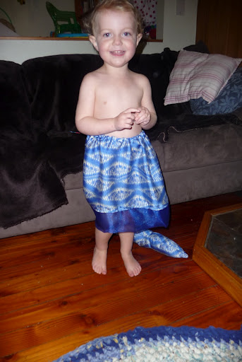 It has been a delightful day of crafts for me. Elizabeth and Daniel have been invited to a birthday party next weekend and I’ve heard, from a good source, that the birthday girl is very interested in Mermaids. So I went to the fabric store and bought the fishiest-looking fabric I could find and made a Mermaid costume. Here’s Elizabeth modelling it: