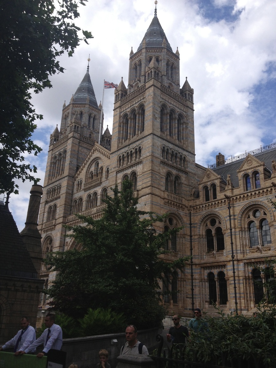 By this time it was early afternoon and the queue outside the Natural History museum had disappeared so we dashed inside just to see an animatronic dinosaur (Daniel was very keen to do this). We were all too exhausted to traipse around it to any great extent and it was just packed with people inside and also rather hot. The building itself though was magnificent to say the least and a museum piece in its own right. A breath-taking work of art. I could not take my eyes off it. It was designed by a relatively unknown architect at the time called Alfred Waterhouse. ย I took a couple of photos of this building which you can see at the bottom of the stack of photos below.