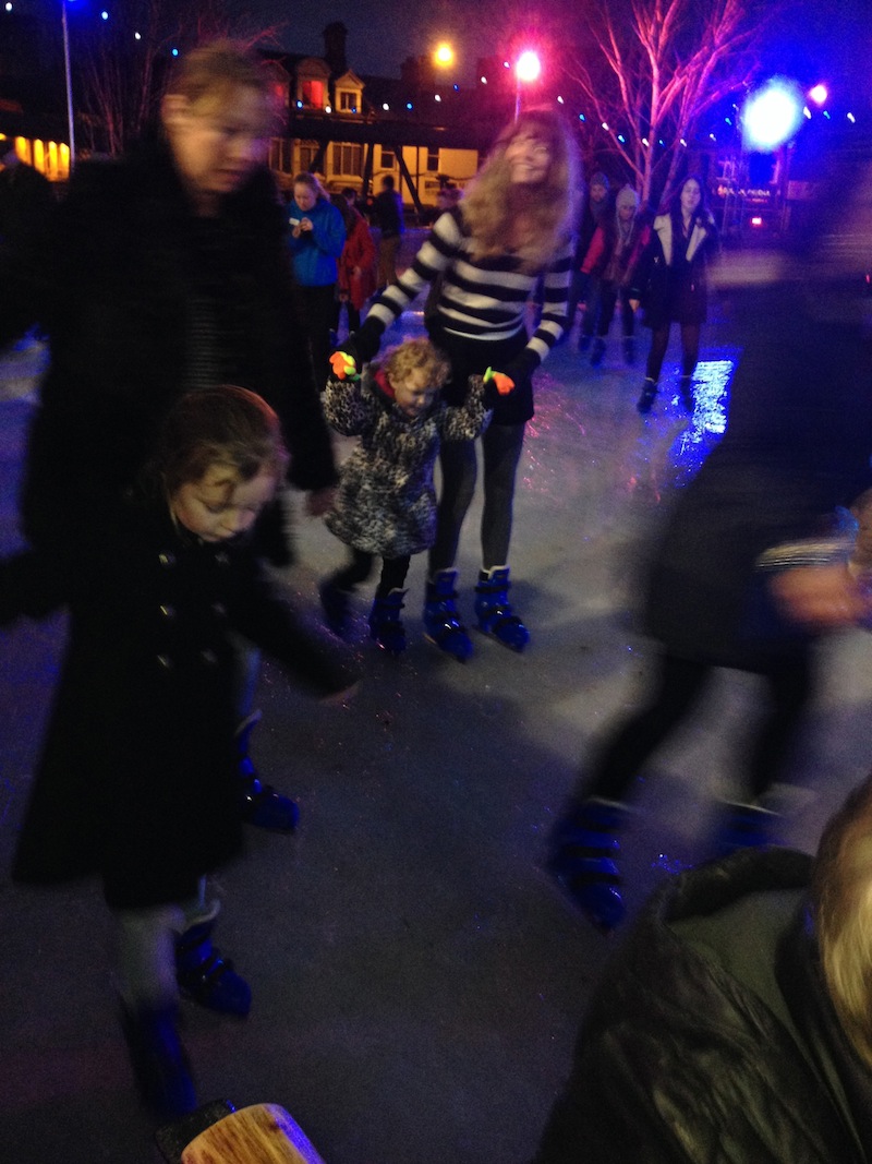 But the crème de la crème was when we discovered the outdoor skating rink (that’s a very blurry shot of me – in the stripy top – with a not so blurry Elizabeth):