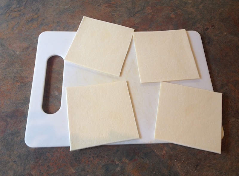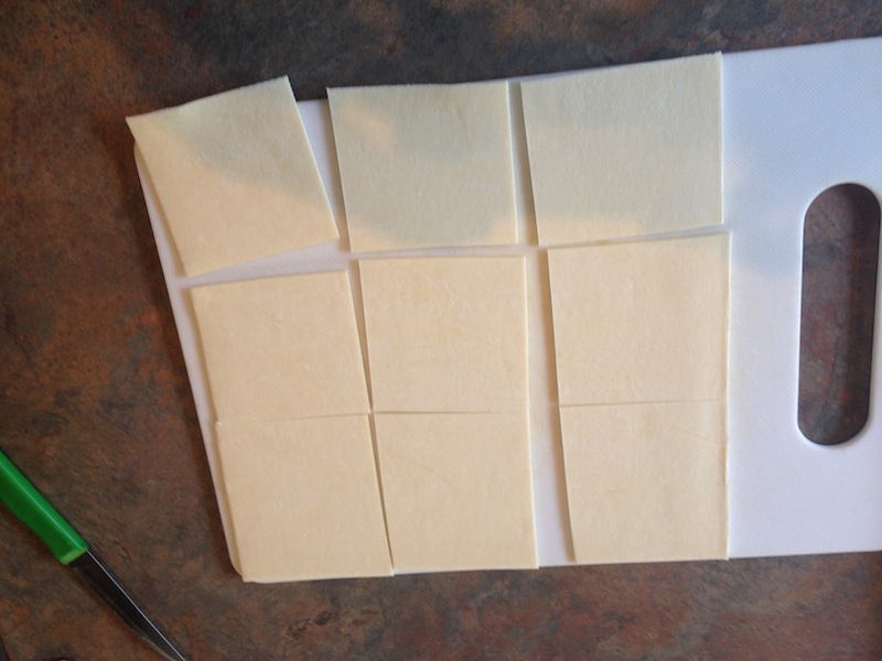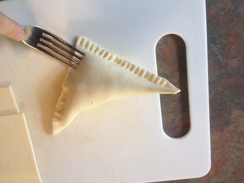 Turn off the heat and let the mixture cool a little. Cut the pastry into squares. I cut it into quarters or ninths, depending on whether I want big ones or little ones. Then spoon the mixture into each square and fold them over to make triangles.