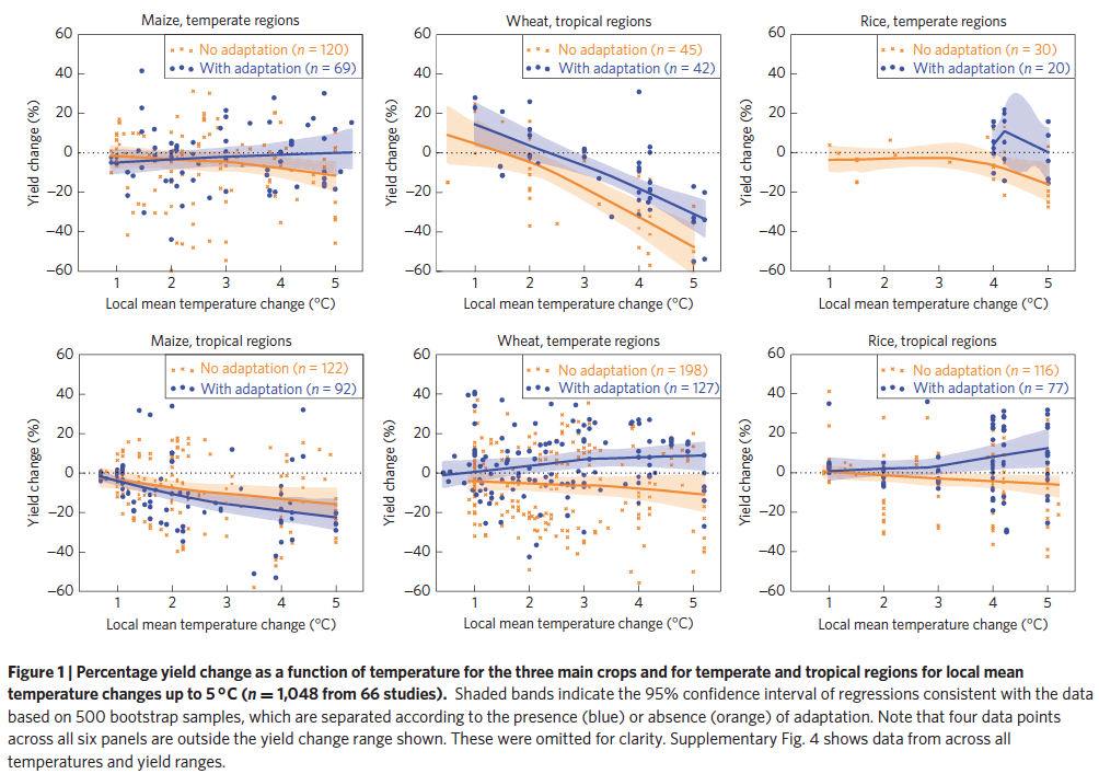 I’ve taken the following image from the paper. It shows crop yields for maize, wheat and rice in both tropical and temperate regions and the impact of temperature up to 5°C, with and without adaptation (click to view a larger version).