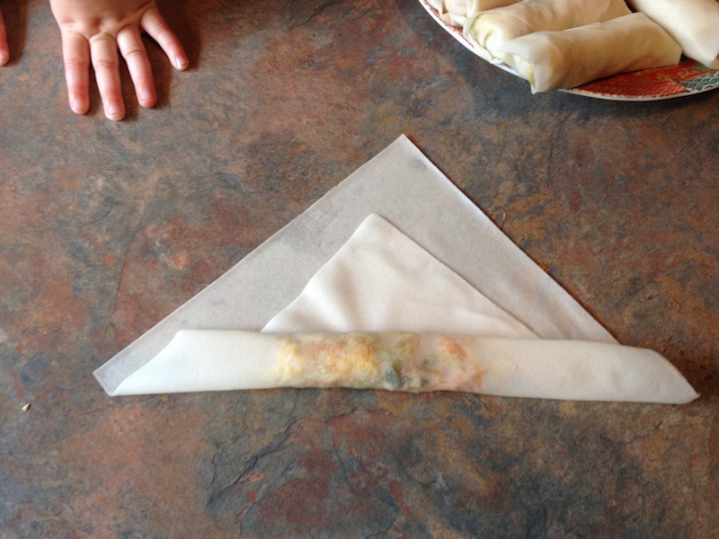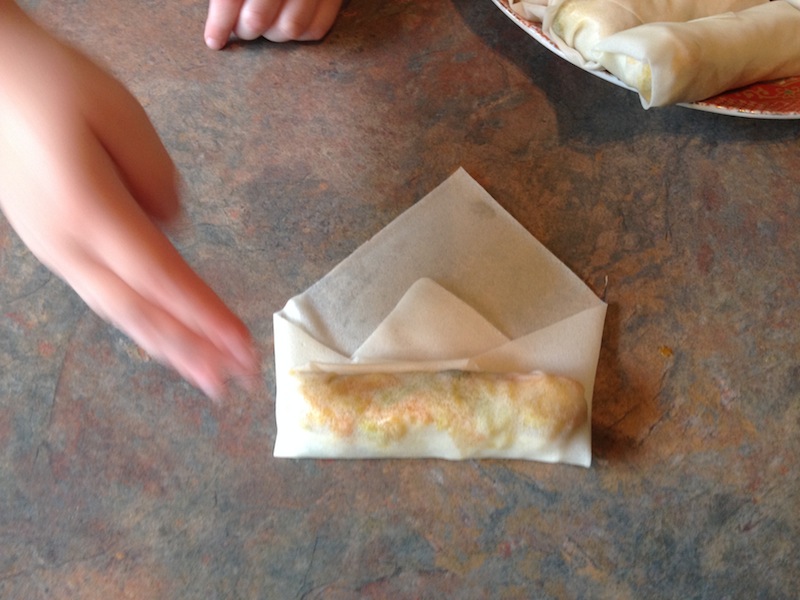 Roll just past half-way and fold in the side corners. Just before the you reach the last corner, dip your finger in a bowl of water and dab the pastry so that the spring roll sticks shut and doesn’t unroll.