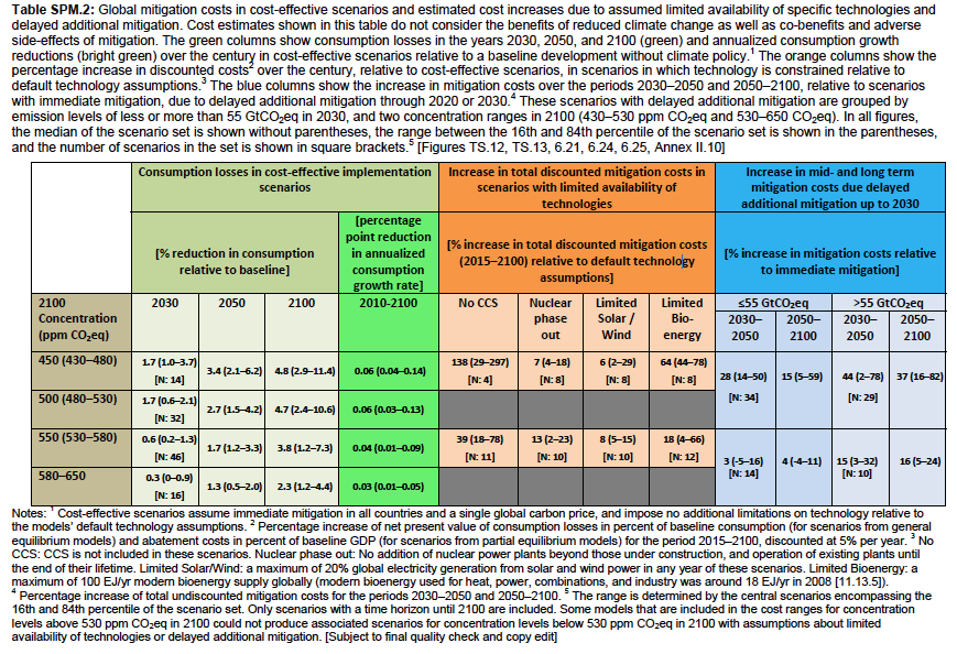 Presumably he’s referring to the 2.1-6.2% reduction in consumption relative to a baseline in the row for 450ppm CO2eq. If so, then he’s chosen the upper value of the range which he tweets as being “Cost of policy higher than 6%”. This figure is also relative to a baseline, not annually. According to this IPCC presentation “this is equivalent to a reduction in consumption growth over the 21st century by about 0.06 (0.04-0.14) percentage points a year (relative to annualized consumption growth that is between 1.6% and 3% per year).”
