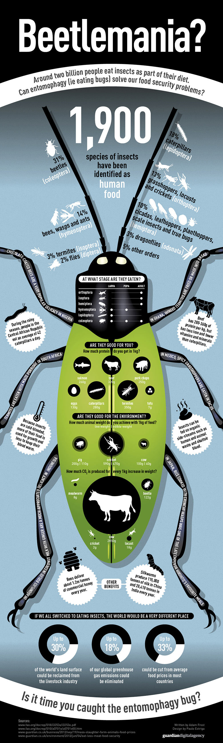 I’ve always been very interested in food and why we eat the things we doย and have recently become excited by the emerging entomophagyย (eating bugs)ย industry. I found this beetlemania info graphic from the Girl Meets Bug blog:
