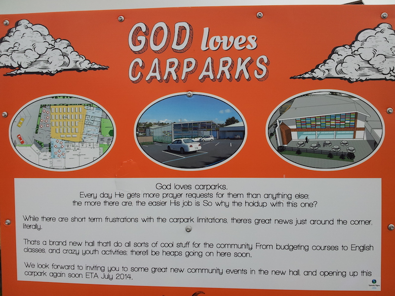 You’d think the church and its community would be very excited about this project and perhaps they are, but it’s not clear this is the case when you see the sign stuck to a fence just outside the church. What are they excited about? A car park. That’s right, a f*cking car park.
