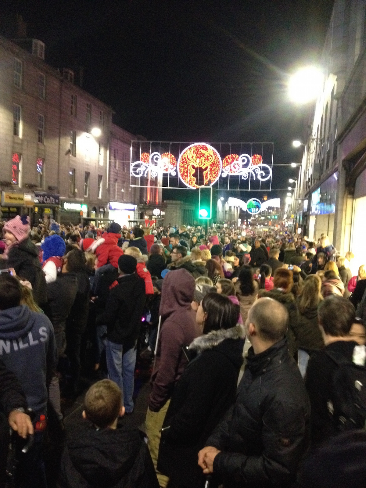 It was the Turning on the Lights Christmas parade in Aberdeen last Sunday. There was a parade;ย they marched; lights went on. It was really good! I think everyone in Aberdeen was there as Union Street was packed.