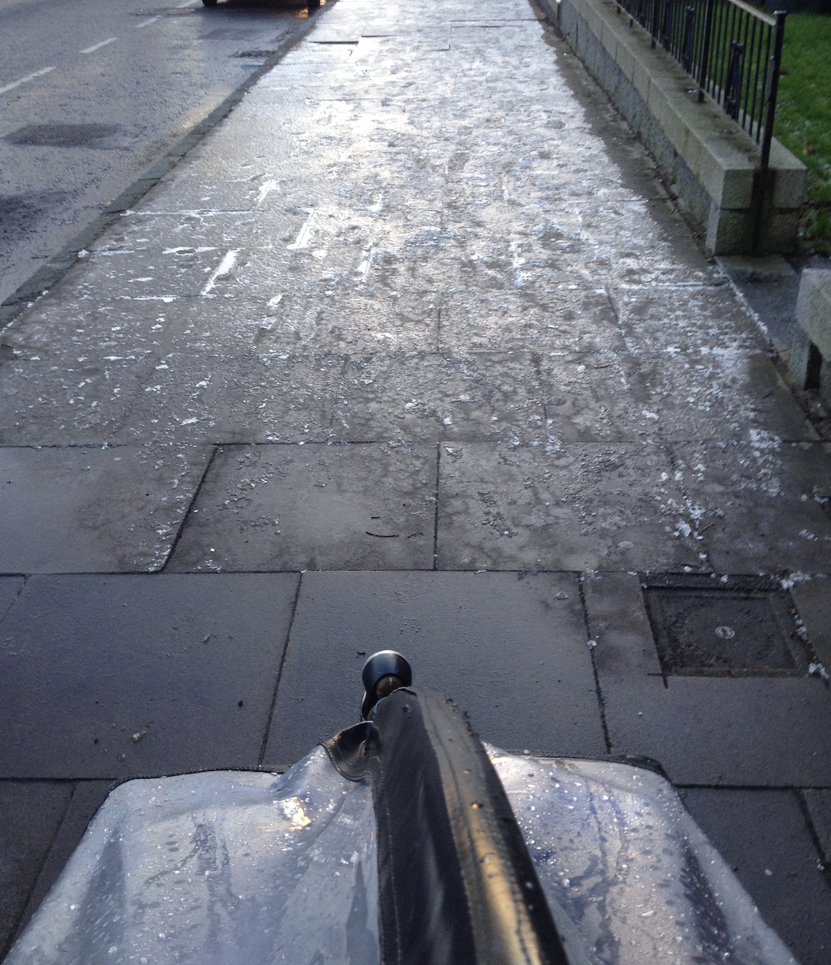 It snowed a bit late last night and then today the temperature didn’t go above 1°C so the snow froze on the roads and pavements creating a a bit of an ice-skating rink. I wasn’t sure whether to cycle the kids to school but I did and it was absolutely fine. In fact, I think it might have been a bit safer on bicycle than on foot. Am I supposed to have winter tyres on my bicycle? Here’s the pavement: