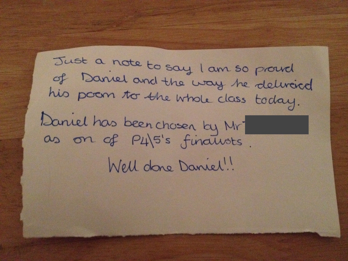 Today is Burns Night in Scotland: an annual celebration of Robert Burns. Daniel had to learn a Robert Burns poem off by heart to recite to the class. We had to rip all of Daniel’s teeth out of his mouth to get him to learn just the first two verses and gave up after that. Then Friday afternoon he came home with this note: