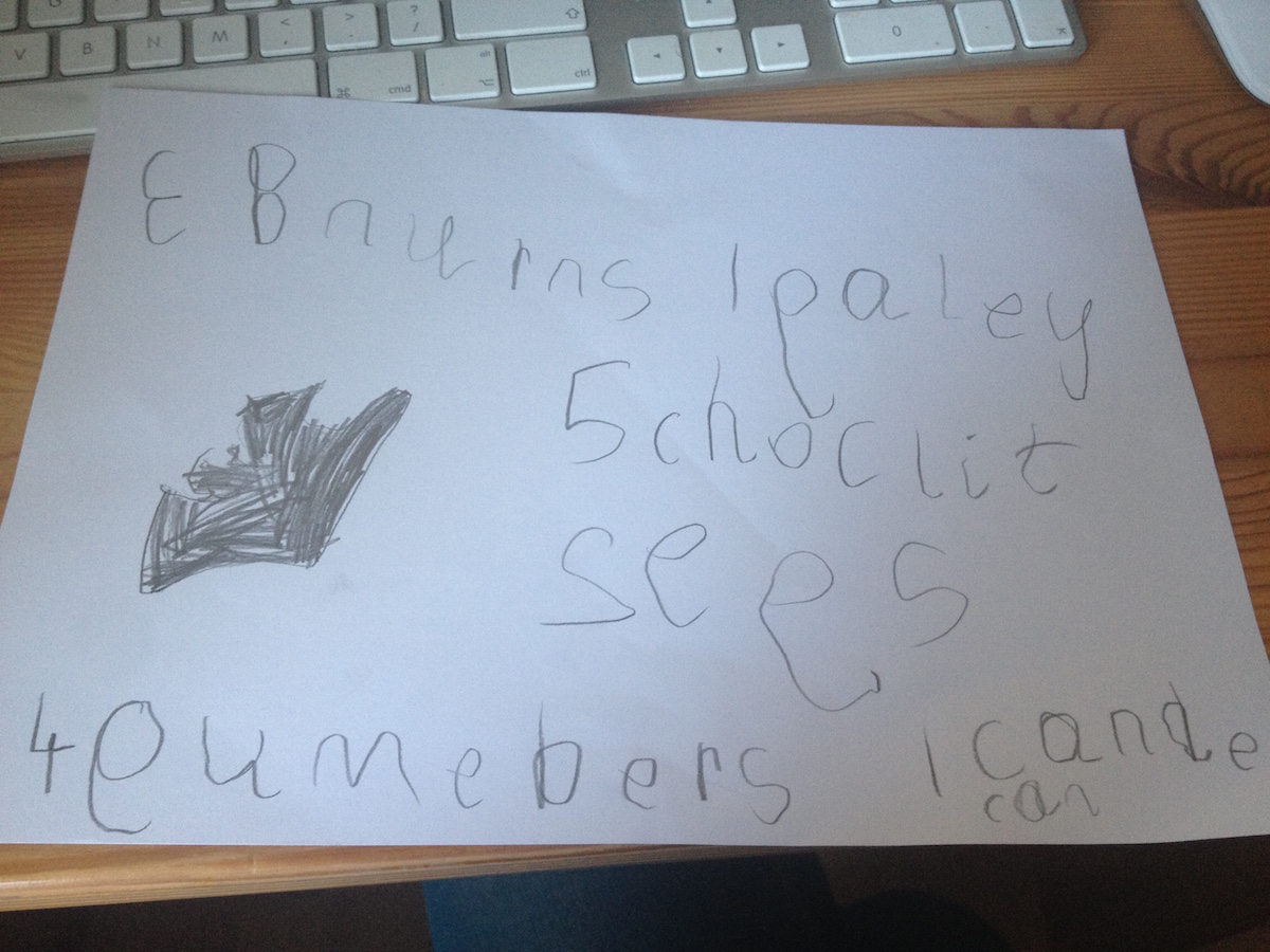 Elizabeth did some more writing today and I thought I’d share it. This is a recipe for a special type of chocolate cake which she has made up.