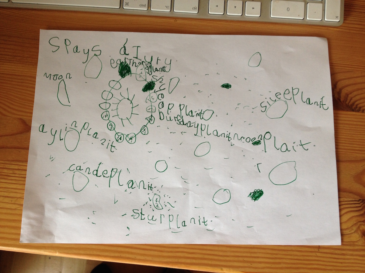 Starting from Earth at the top (under Space diary) and moving aroundย anti-clockwise: moon, alien planet, candy planet, star planet, sheep planet (must be NZ), birthday planet (she pronounces birthday, birfday), moon planet, sleep planet. I like the sound of birthday planet.
