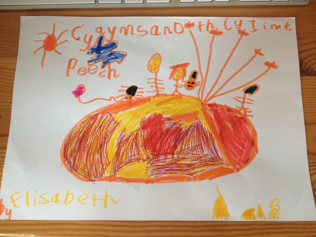 I’ve just finished reading James and the Giant Peach to Elizabeth. She was very taken with the story andย has starting writing aย book about it. Here’s the front page and the first page:
