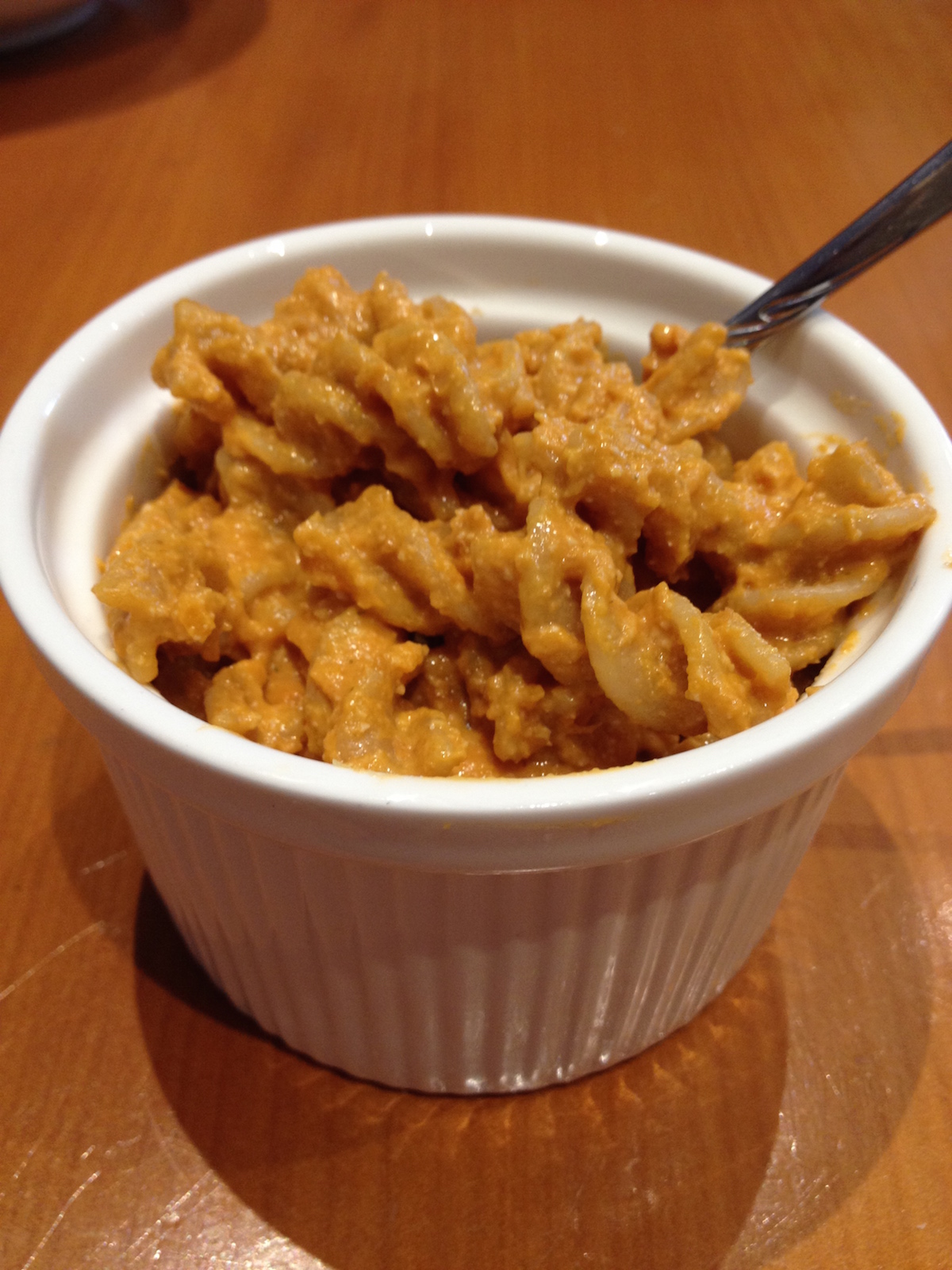 When the pasta is done, pour the sauce over the top and mix well. Serve and eat!