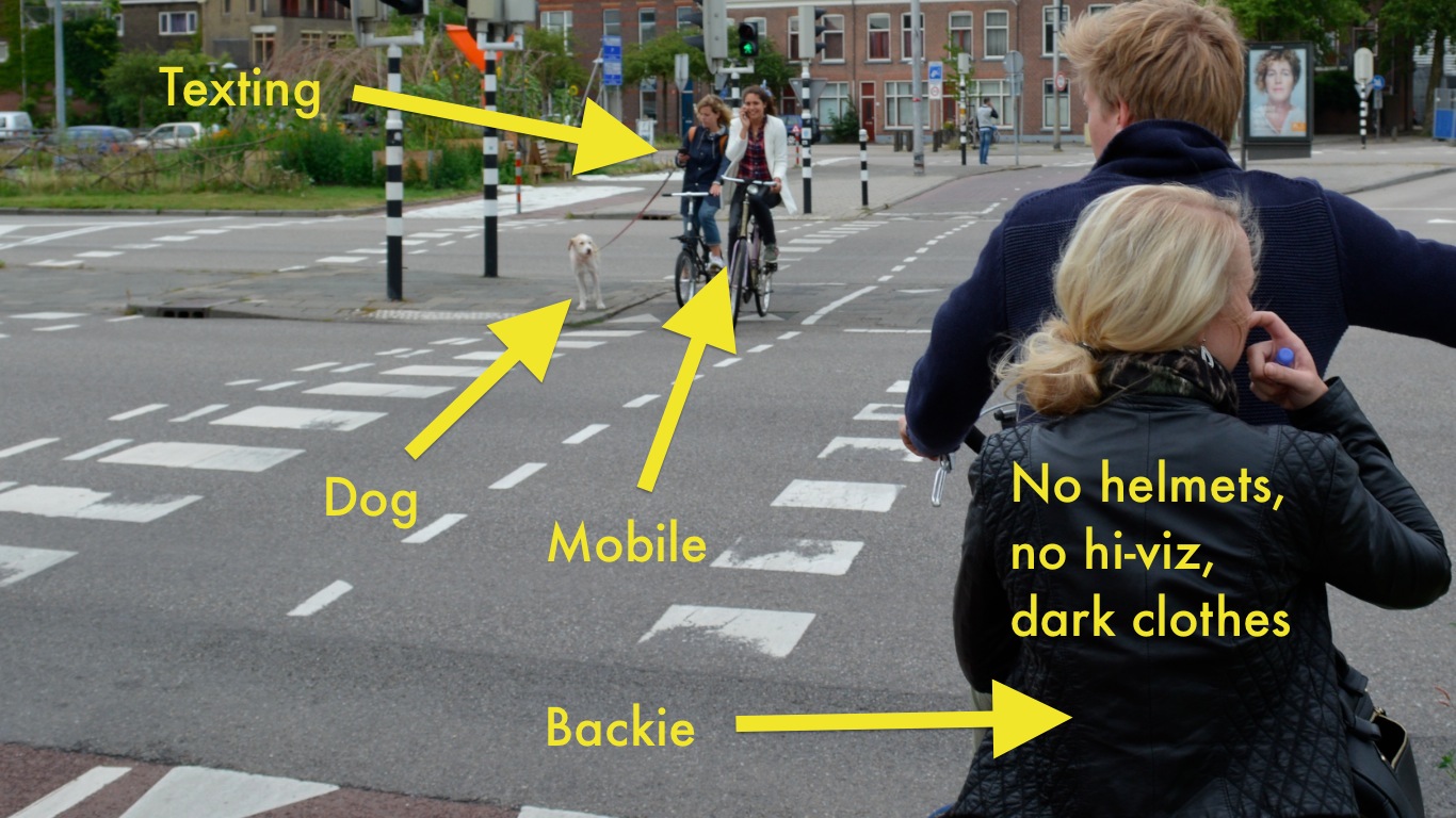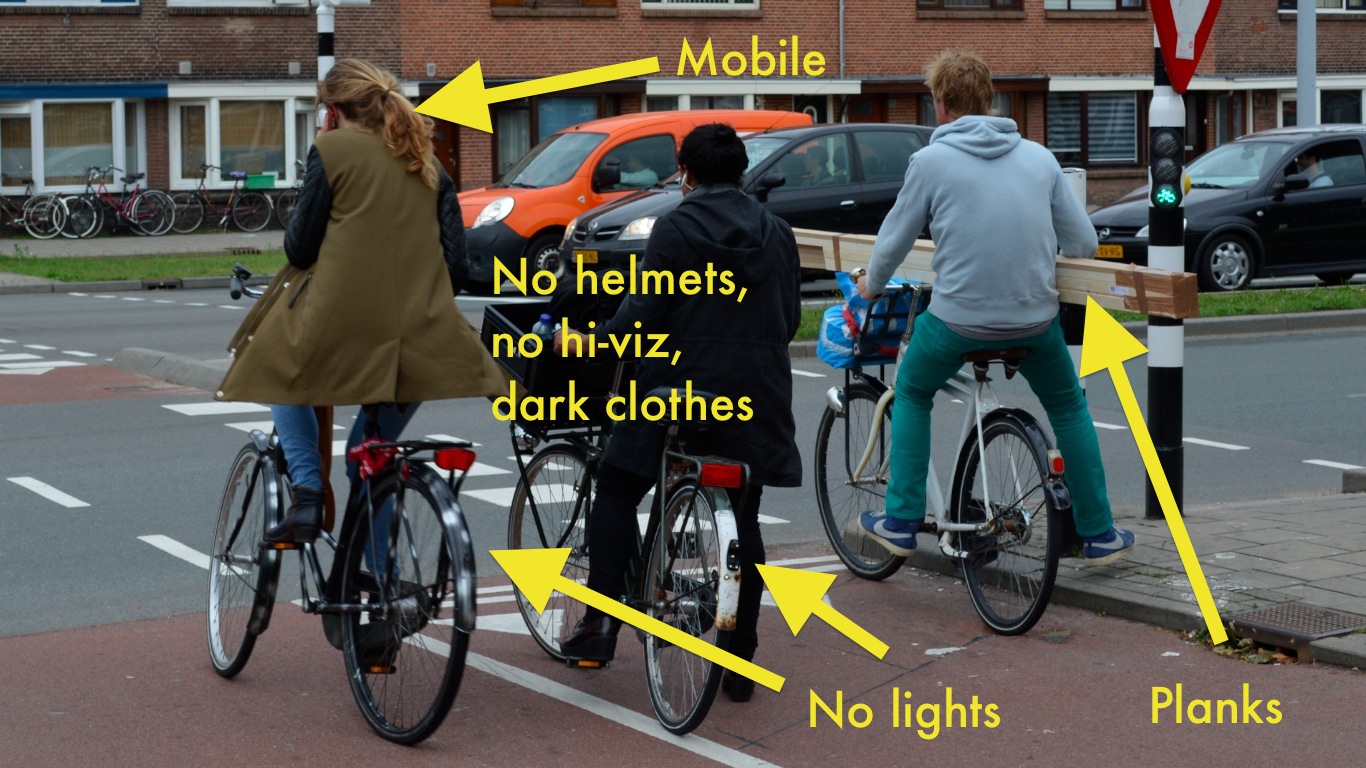 I shared some pictures the other day,ย in an attempt to convey a fairly simple message โ€“ย that the safety record of the Netherlands for cycling is almost entirely attributable to the physical environment people cycle in, and that it isnโ€™t down to exemplary behaviour (either of people cycling, or of people driving), or down to clothing, or safety equipment, or special lighting, or any other kind of gimmick.