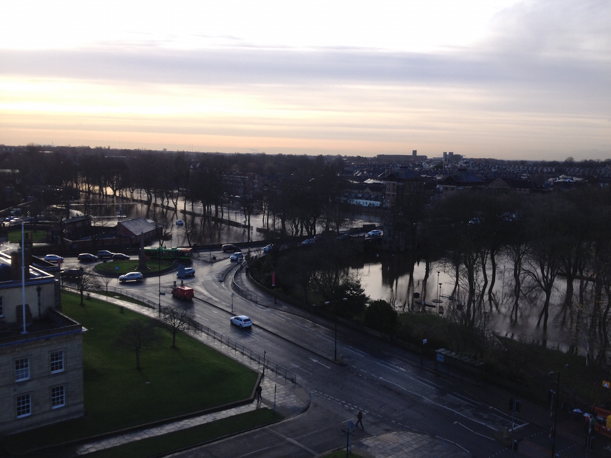 There’s a good view of the flooded river from the top of the tower in the next photo. The trees in the photo are underwater and they shouldn’t be. That’s where the bike path is that I used to cycle along: