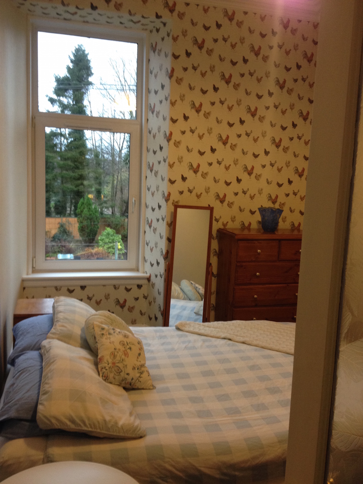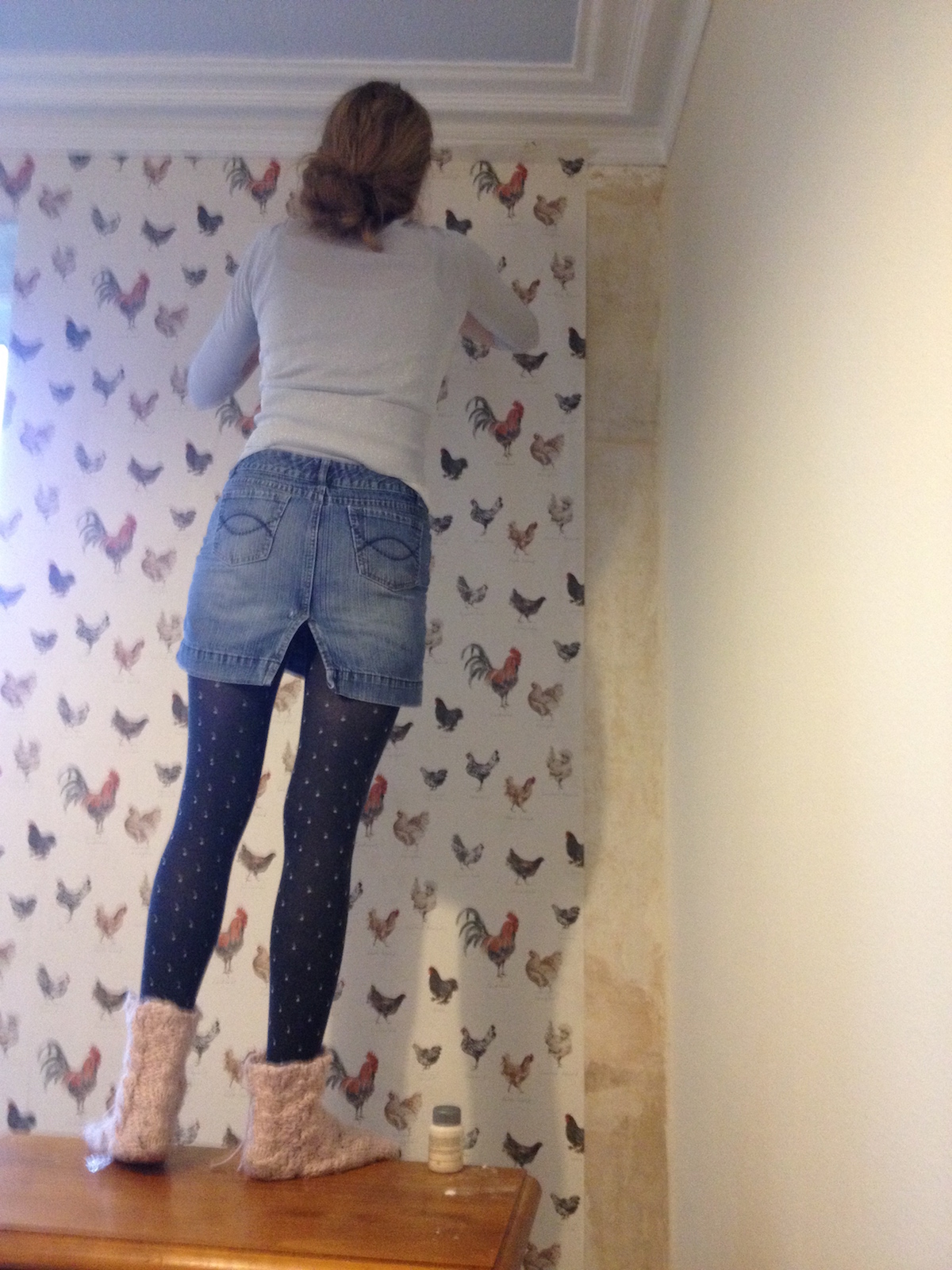 The room isn’t quite finished. It still needs painting as the walls and ceiling are blue (what were they thinking!!!). I painted all the walls around the wallpaper earlier in the week because I thought it wise to do it before wallpapering otherwise I would be sure to get paint on it. But I still have more to do, including the ceiling. But it’s a huge improvement on how it was and I rather like the chickens. It was not an easy job but I would do it again.