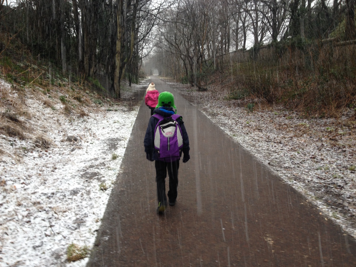 Busby is still at the bike shop so the kids have had to walk to and from school. A bit of snow made it all the more exciting. There was a bit of grumbling from Elizabeth because I forgot to bring her water proof gloves and she got hers all wet playing with the stuff … and eating it.