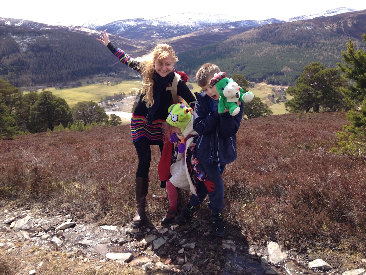 Two posts in one day because we’ve just come back from a fantastic walk in the hills and I like to relive the experience by writing about it and looking at all myย photos. It’s a glorious day here today and so we decided to make the most of it and go for a medium length walk into the hills above Mar Lodge. We did almost 9.5km – according to my Fitbit – and although our kids are pretty good walkers they haven’t done much hiking. The worst bit was at the top on aย flat stretch which was very muddy and difficult to navigate. Both of them were in tears at this point and carrying on as though the world was about to end. Fortunately this bit didn’t last very long and very soon we were on the downward stretch and their good spirits returned. We also saw a red squirrel! There wereย patches of snow here and there which made for some snow ball fights but the best part, for me anyway, were the views.