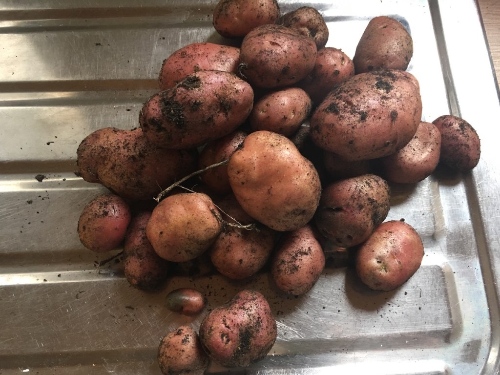 Before the summer holidays the sack was full of foliage but when school started again all of it had died down. I wasn’t sure what that meant as I’ve never grown potatoes before but I decided to empty the sack and haveย a look. Here’s what I found: