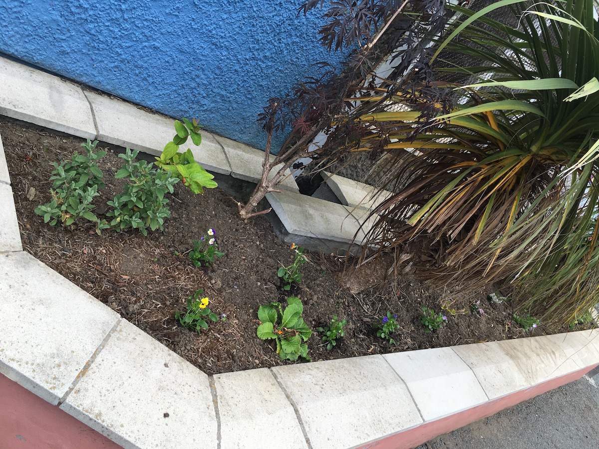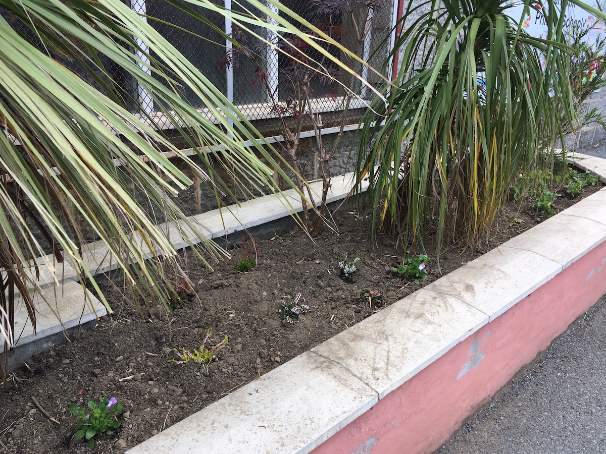 I planted the small shrub on the very left in this next photo as well as the violas. There’s so much concrete and asphalt in the playground and it desperately needs soft and leafy things to balance the harshness.