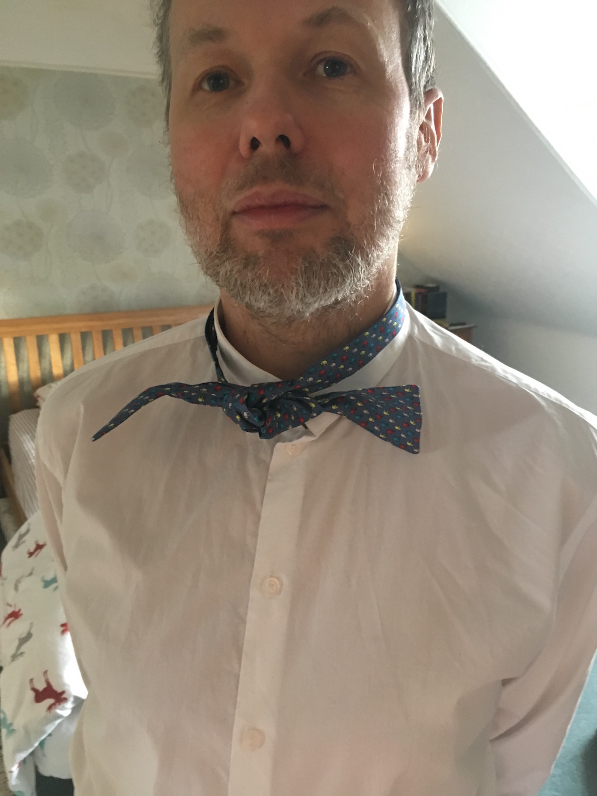 I got Ben a bowtie with elephants on it. Here’s my first attempt at tying it.