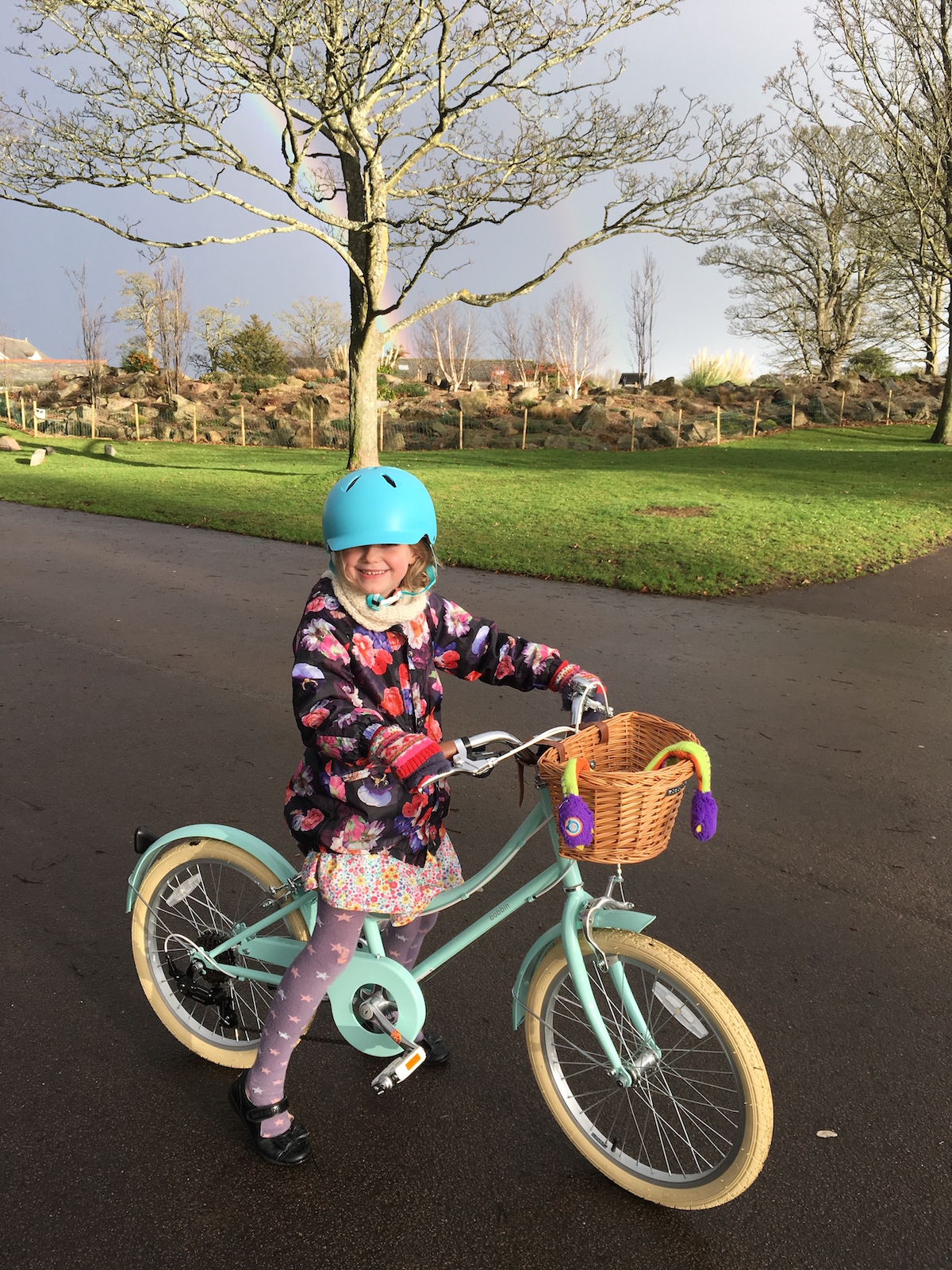 Her new bike is a Bobbin bike and is exactly how a bike should be with mud- and chain guards, a step-through frame, and a basket on the front for carrying things. Without the mud guards she would end up with a black line of dirt and mud all the way up her back. Why would anyone want that? And yet most of the bikes you see in a bike shop today do not have mud guards. I am constantly bewildered by this. The basket provides a receptacle for carrying things – where can you put belongings without the basket? The step-through frame means she can go from walking to cycling and cycling to walking without having to stop the bike. It might be a little while before she’s capable of doing that but it’s something I value greatly on my Dutch bike. It makes cycling more efficient as it allows me to maintain the momentum. A chain guard is also essential as it protects your clothing.