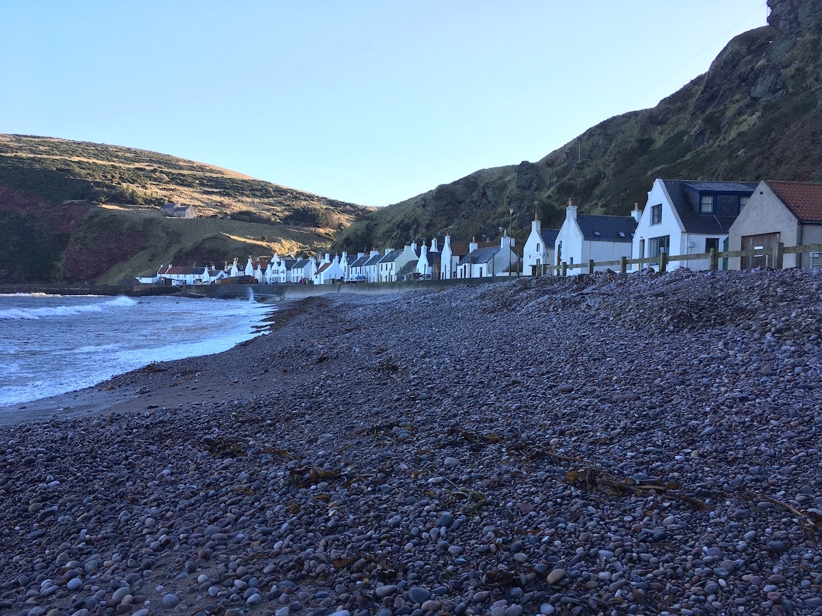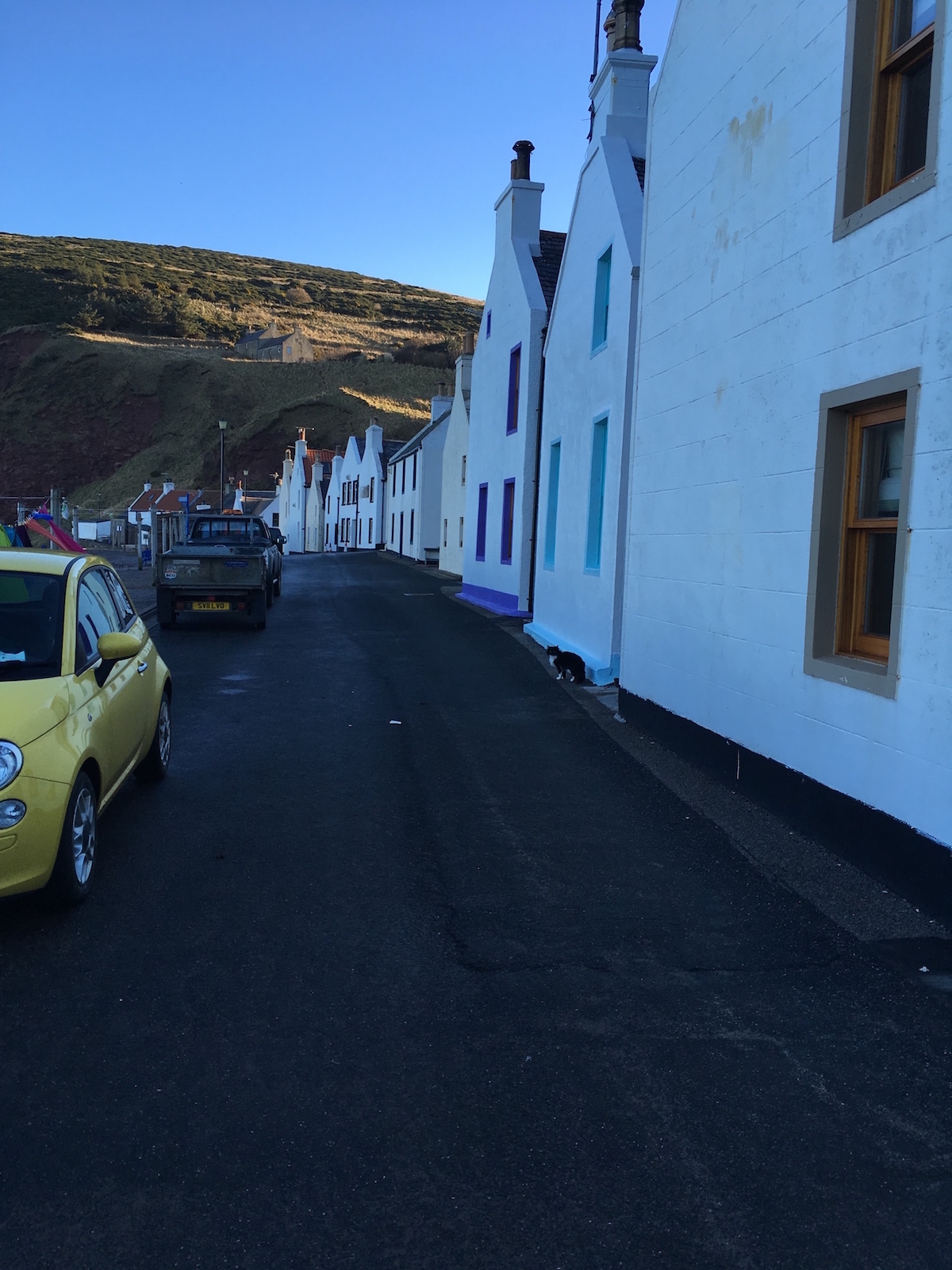 Consequently we left fairly early and went to Pennan. I was looking forward to visiting this tiny fishing village after watching the film, Local Hero. Something which is not clear in the movie is that Pennan is at the bottom of a gorge between two very steep cliffs. The road down to the village is very steep and narrow and not something I’d want to drive down in the snow or frost. Despite having a northerly aspect the cliffs cast a shadow over the village. We were there at 10am and although it was a brilliantly sunny day, the entire village was in the shade. I imagine they must get some winter sun but the cliffs are so high and so close that it’s probably only very little over winter. The cliffs make an impressive backdrop to the white-washed brick homes along the shore, though. It was cute.