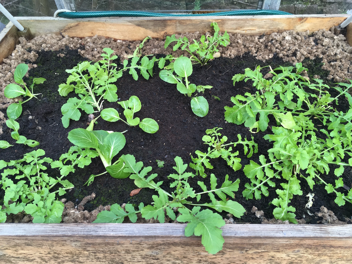 After doing nothing all winter my pak choi is also starting to take off.ย I put wool pellets around the edges of this garden bed in the hope it will deter slugs and snails. None of them have woken from winter yet soย I’m not sure if itย will work but it did make the greenhouse smell like sheep which was rather nice.