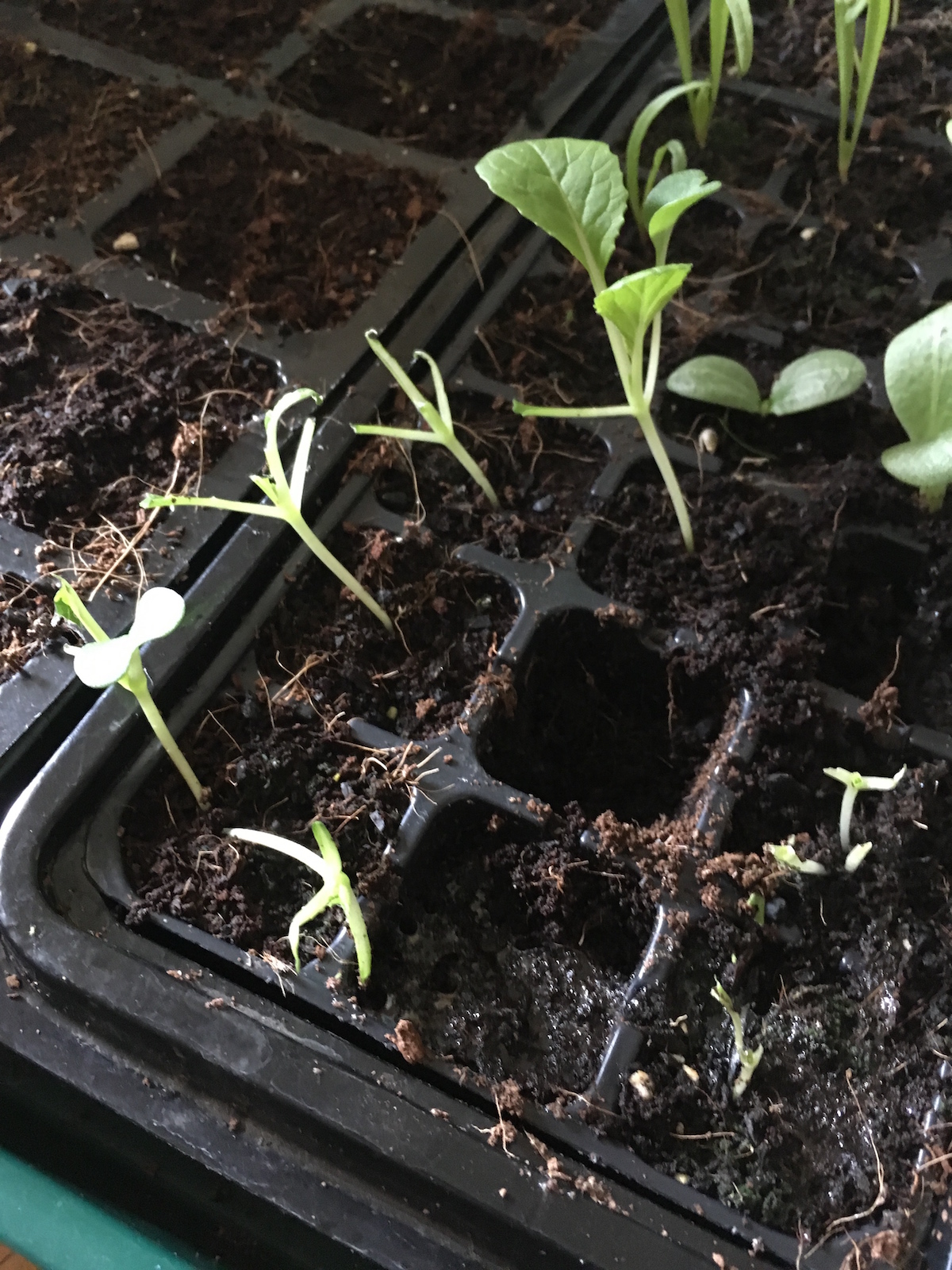 It’s frustrating to watch seeds germinate and then grow only to see themย eaten by slugs a week later. In an attempt to outwit the slugs, yesterday I movedย two trays of seedlings inside overnight and put them on our dining table. When I woke up this morning I saw telltale signs of slug dining: there were more leaves missing and a silvery trail on the dirt.
