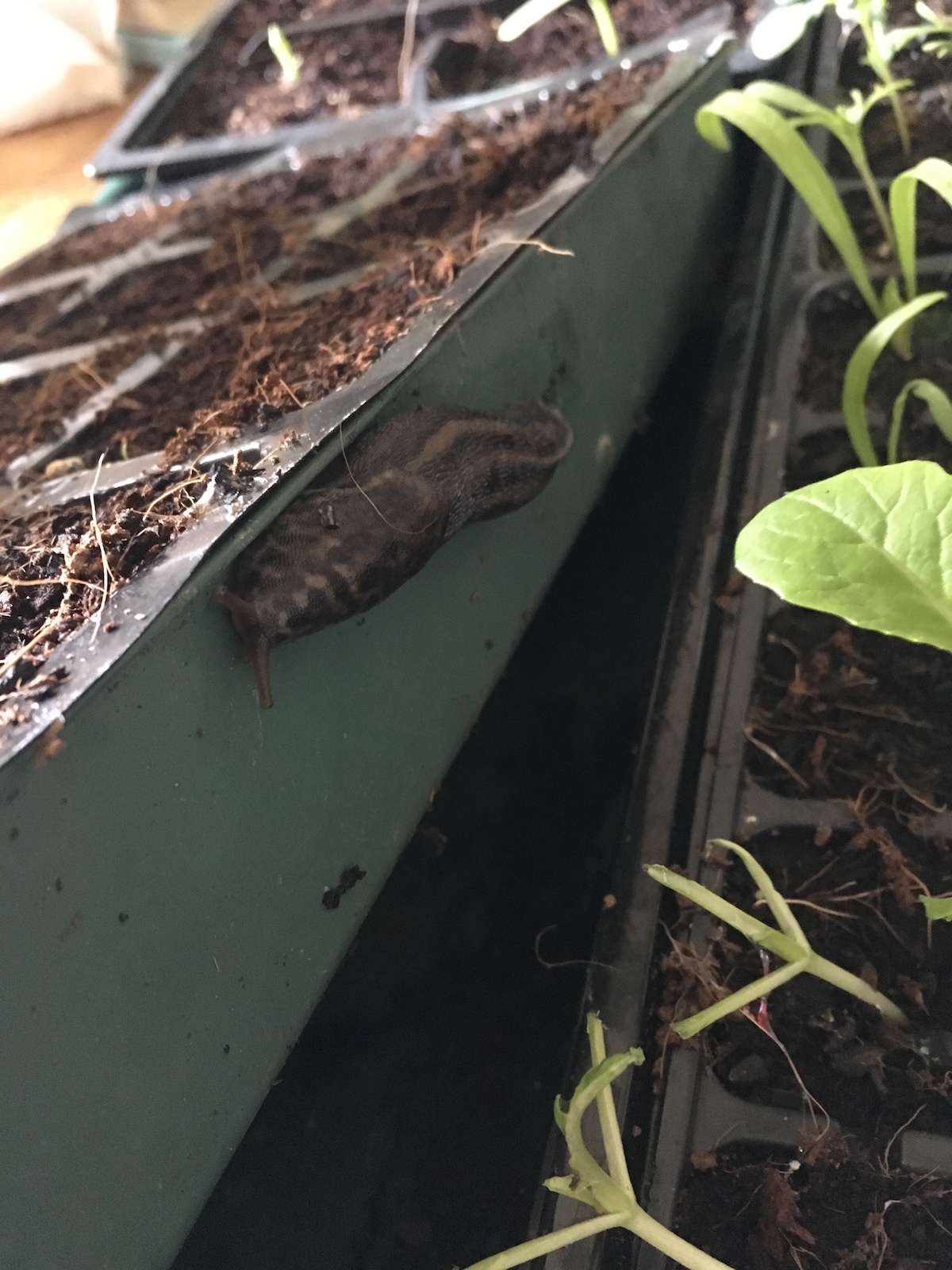I’m such a moron. I brought the slug inside with the seedlings and he spent the night munching away on our dining table! I’ve been outwitted by an invertebrate.