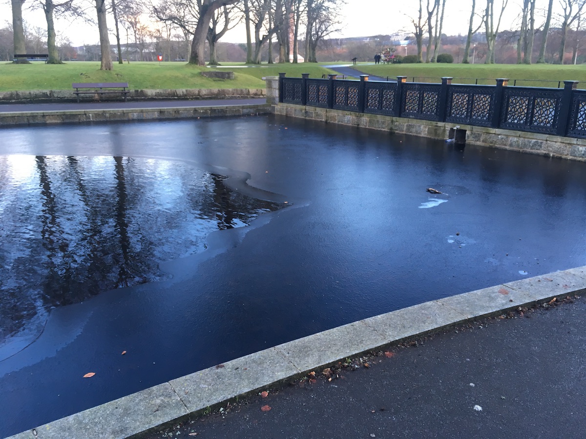 After a very mild Christmas the temperature has suddenly plunged. There were a few flakes of snow today and the pond at Duthie park is starting to freeze over.