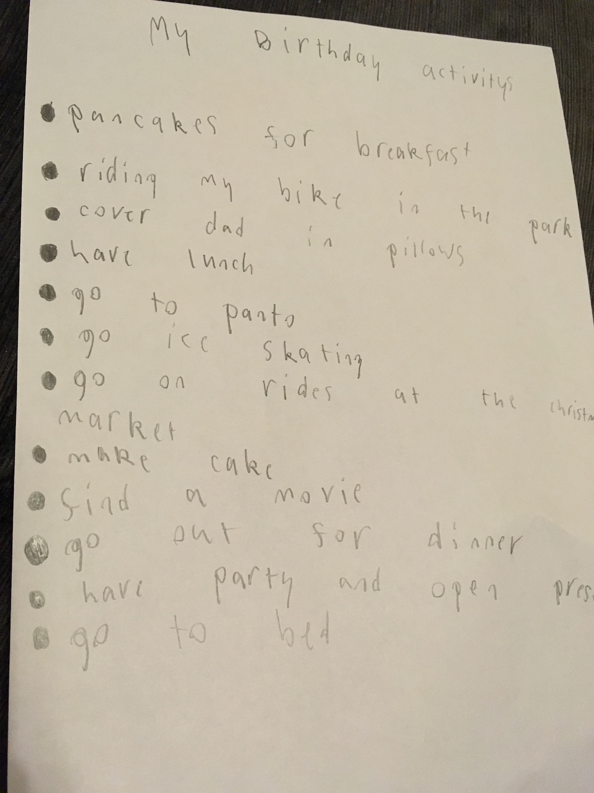 We found it interesting that she put “open presents” as one of the last things to do today. She has opened a couple of present already this morning but all the rest she’s chosen to save for later. This is impressive and demonstrates that she’s developed a sense of delayed gratification.