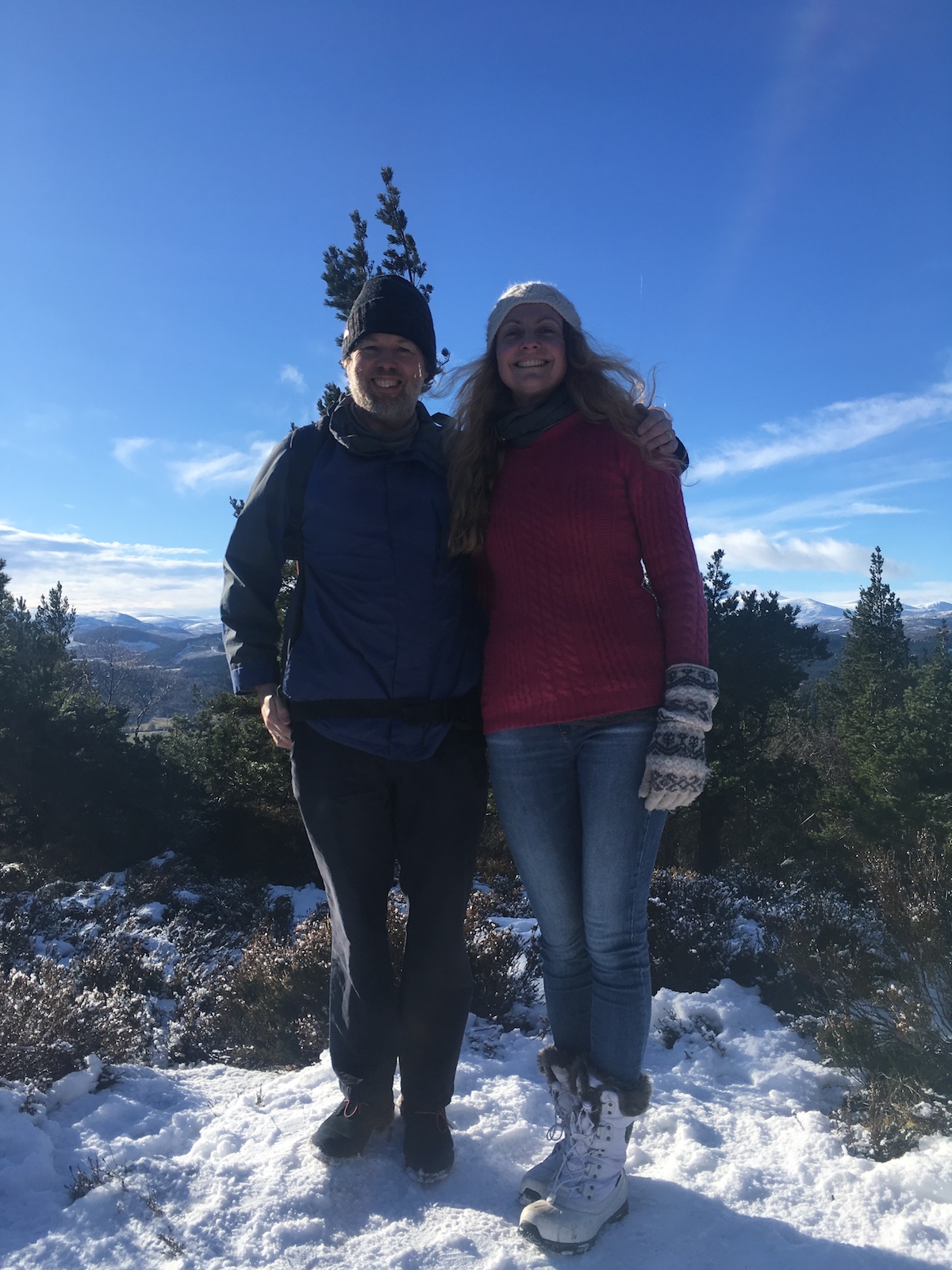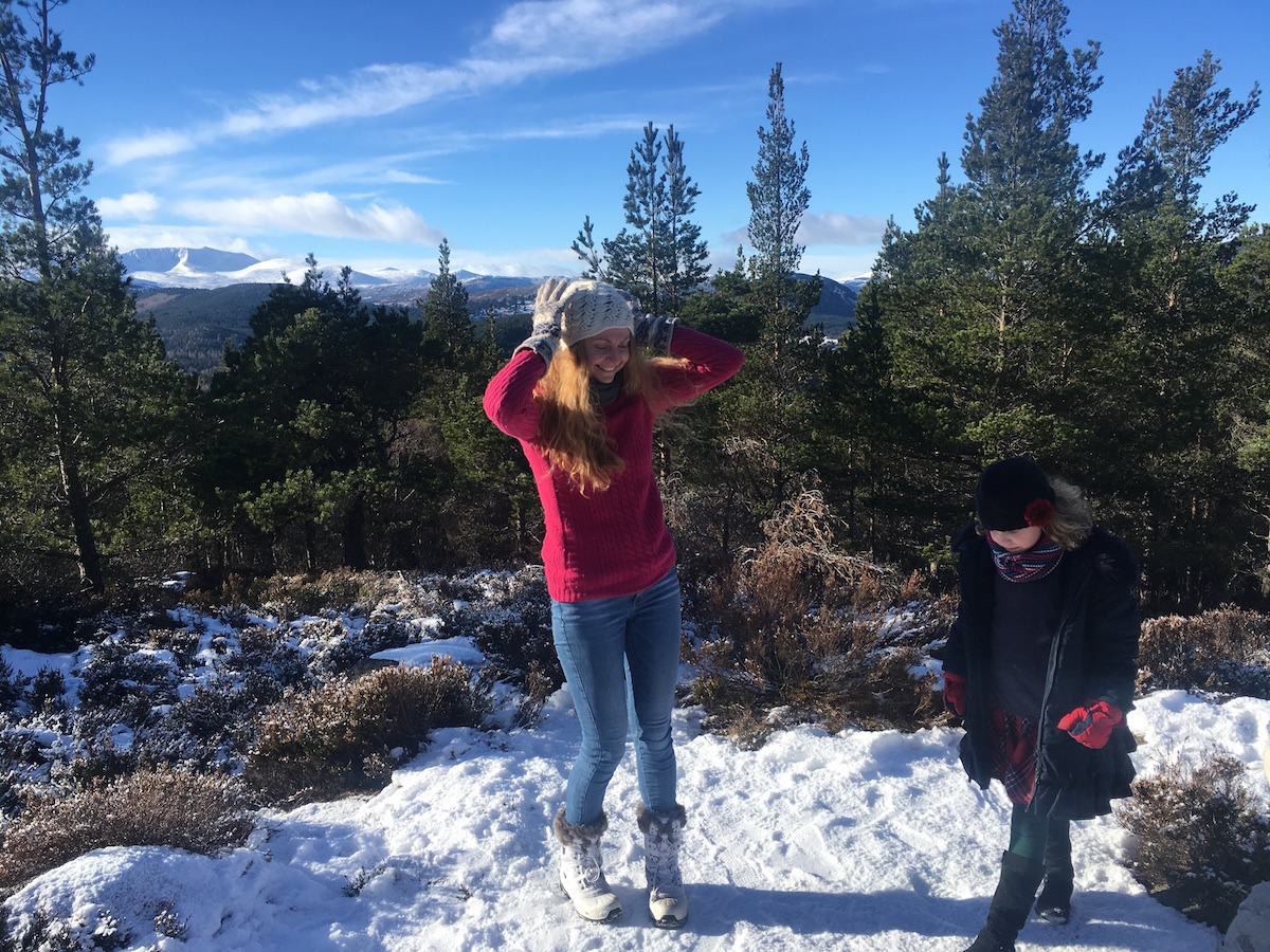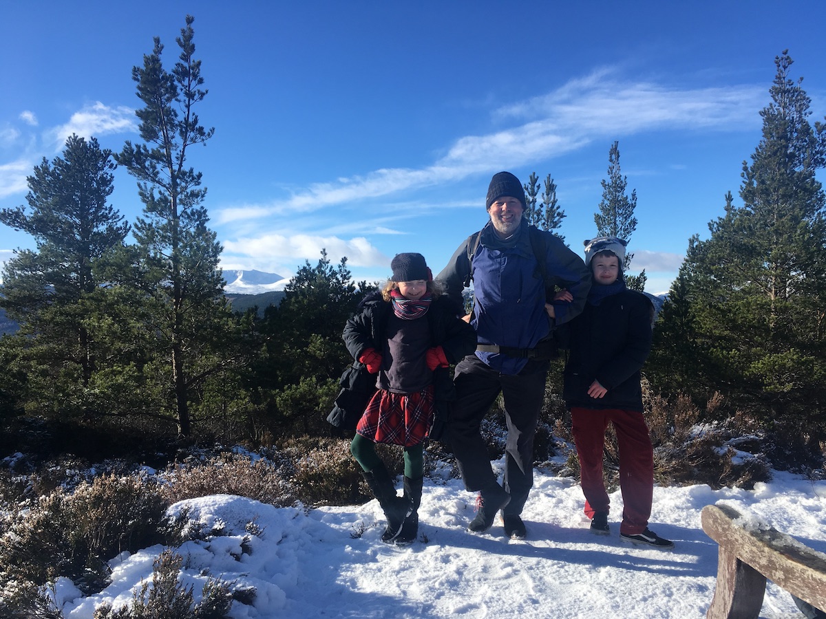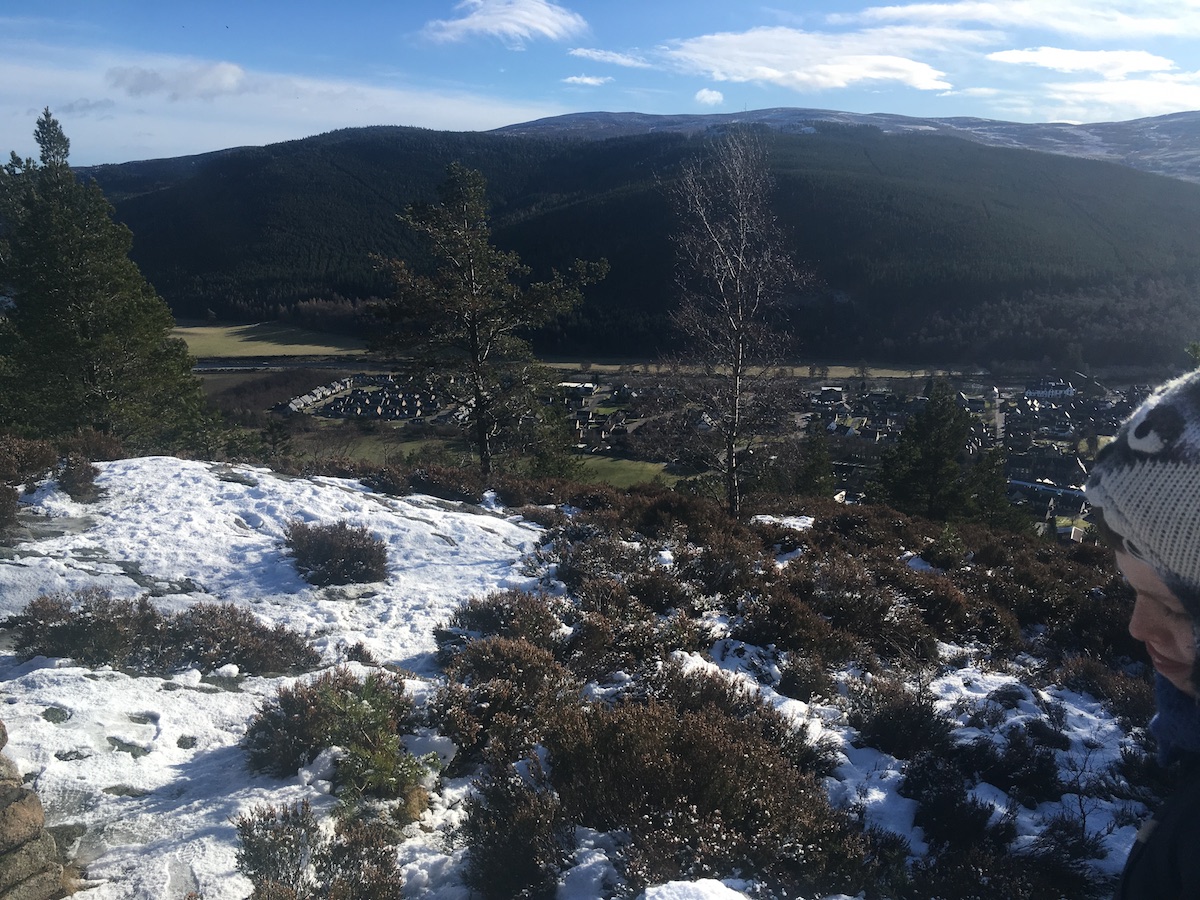 Today we walked up Craigendarroch which means hill of oak (craig = hill or crag/rock, and darroch = oak). It’s a steep, rocky hill overlooking the village of Ballater. From the ground it doesn’t look very inviting because of the rocky cliffs and indeed the women behind the reception desk in our hotel tried to talk us out of it. “Too steep and icy”, they said. We decided they didn’t look like hill walkers and so we went anyway. It turned out to be pretty easy and not particularly treacherous at all. It also didn’t take very long – probably about a two-hour walk up and back. The views from the top are magnificent. I’m now wondering why we haven’t done it before. If you’re in the area then I highly recommend it.