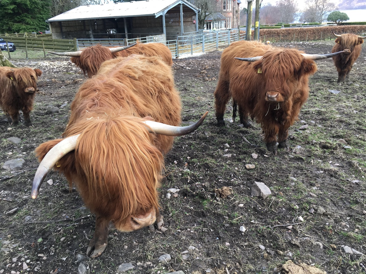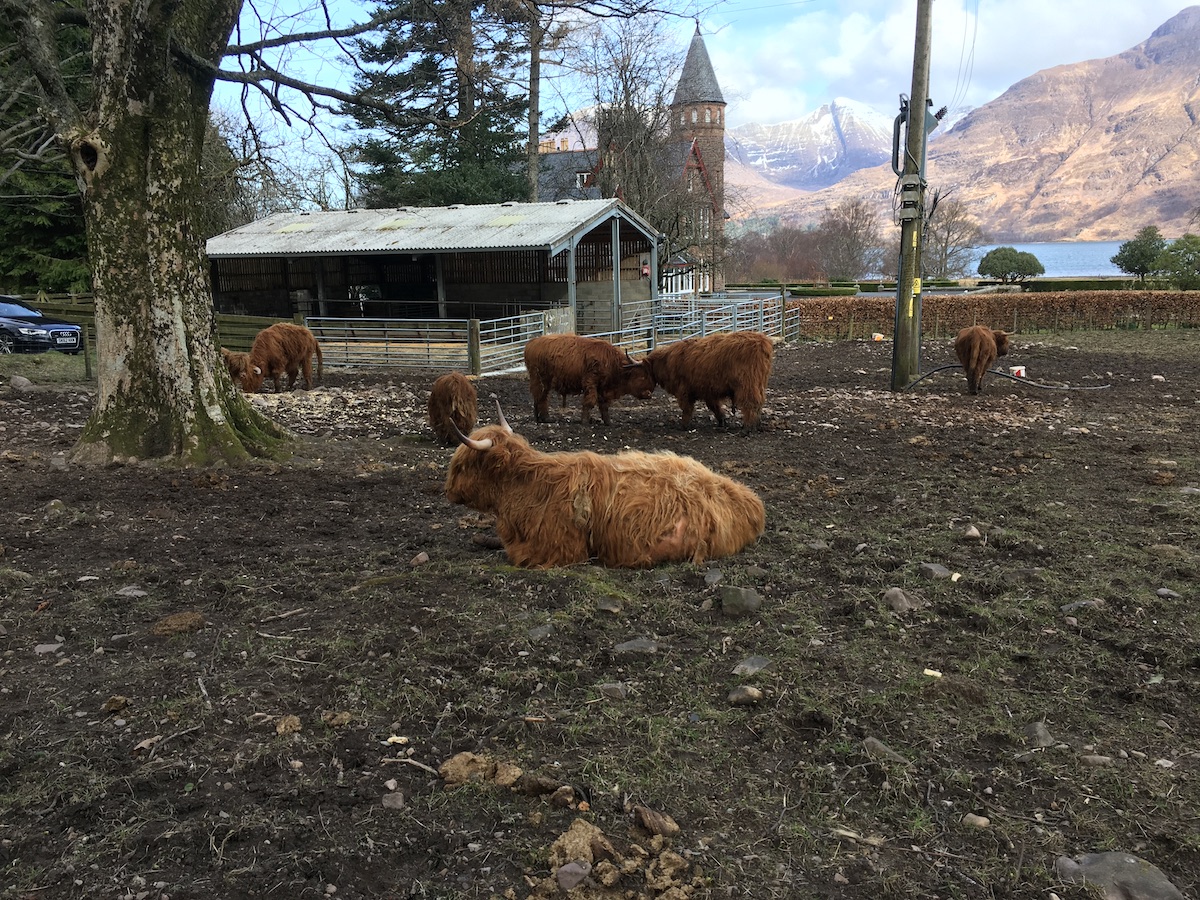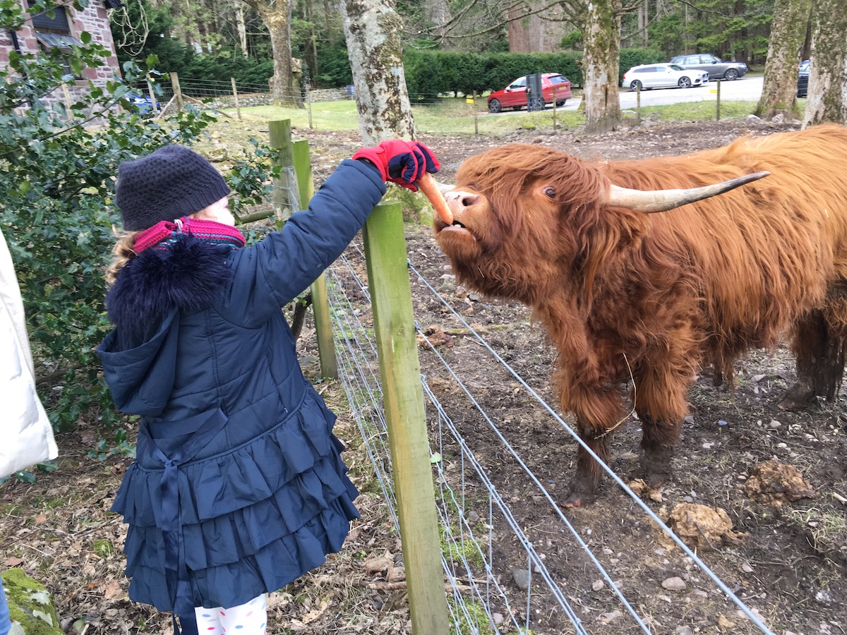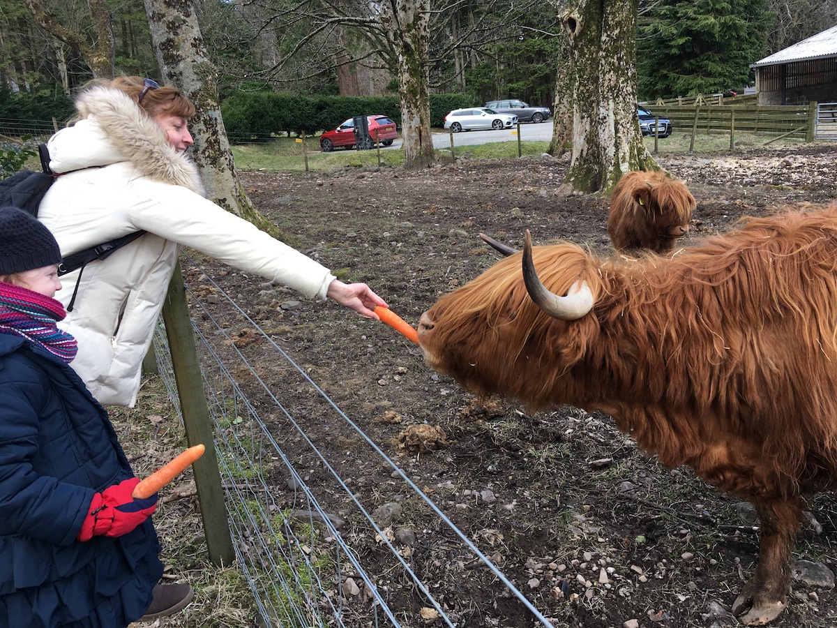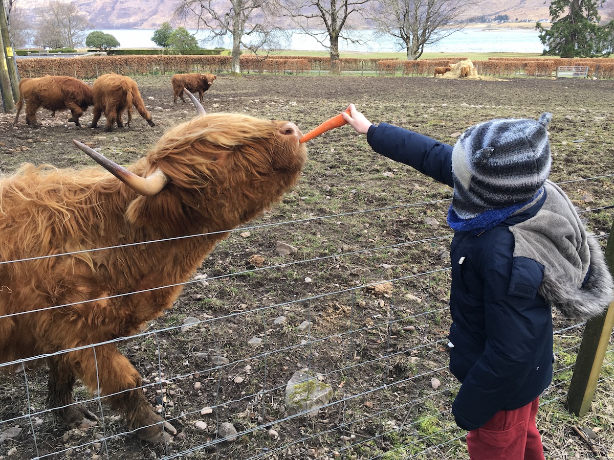 We stopped at the Torridon Inn where we had lunch and fed some Highland Cows! Highland Cows are one of my favourite animals, right behind red squirrels, so this was absolutely delightful. The kids liked it too. I never knew Highland Cows ate carrots.