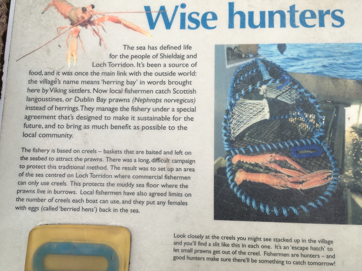 We also stopped at Shieldaig which is a very cute fishing village a few miles from Torridon. It’s on Loch Shieldaig where they fish for prawns using traditional methods only. Industrial-scale fishing, like bottom trawling, is often harmful to the environment. In bottom trawling they drag huge nets across the sea floor, picking up everything along the way. I once heard David Attenborough describe it like dragging a huge net across the countryside and picking up not only the cows and pigs but also the trees, shrubs, fences, and farmhouse all at the same time. It should be banned and I’m happy to say it is in Shieldaig. Instead they use traditional baskets called creels.