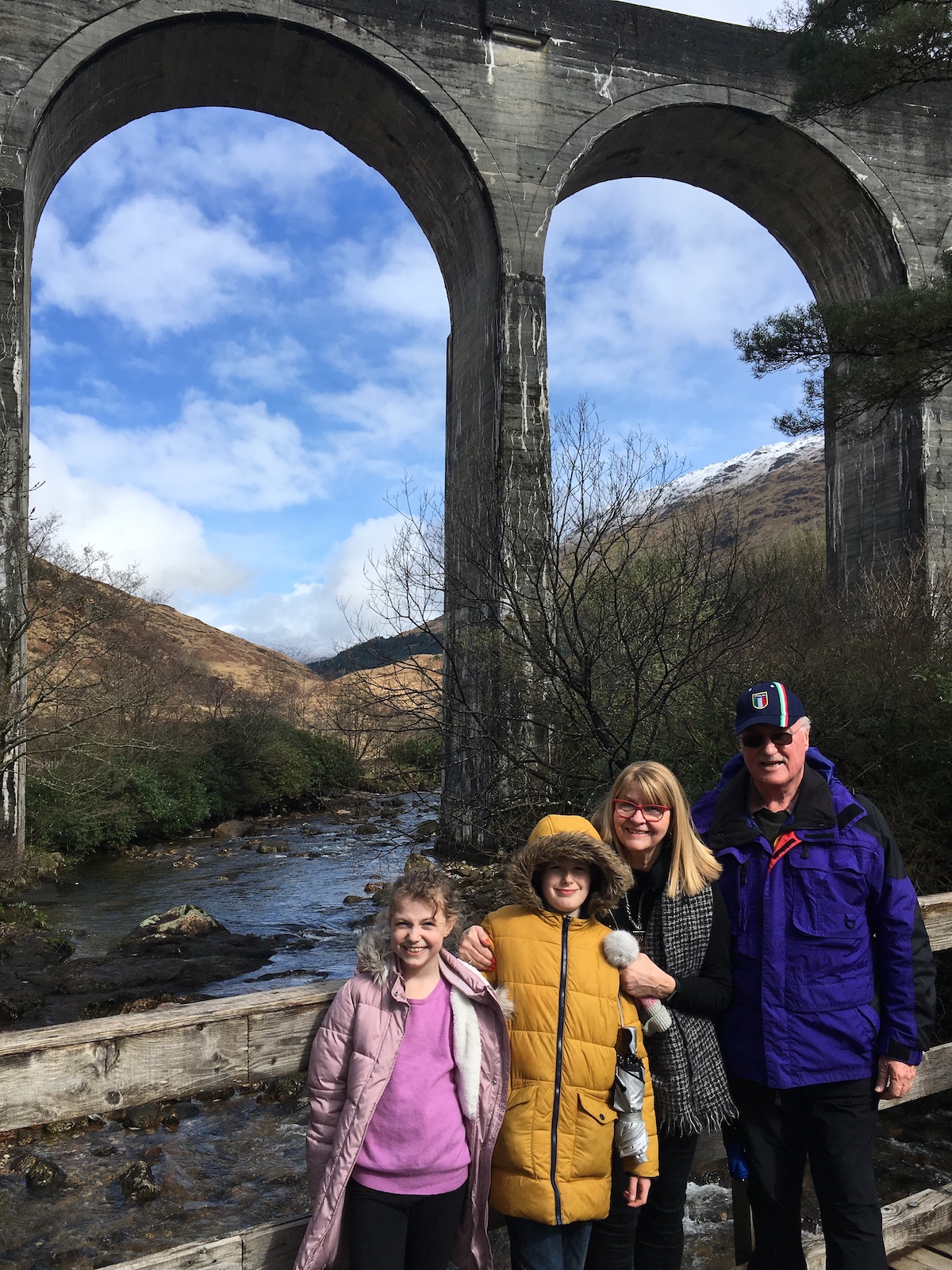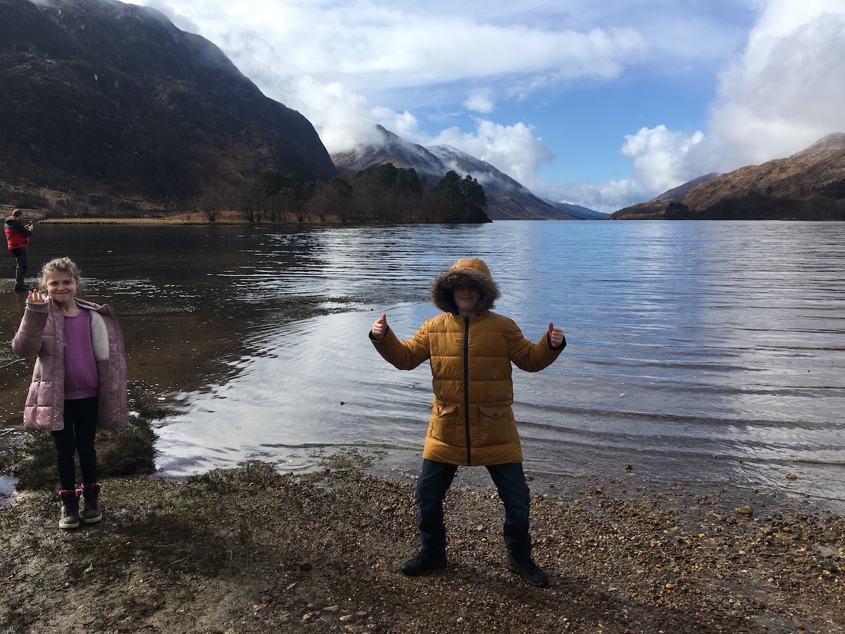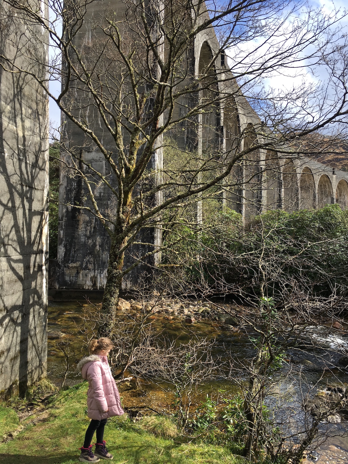 We visited the Glenfinnan Viaduct which is a concrete rail bridge built in the late 19th century. It’s located at one end of Loch Shiel, in the west of Scotland, about 17 miles from Fort William. It’s famous for being a film location in the Harry Potter movies: the Hogwarts Express traverses the Glenfinnan Viaduct on its way to Hogwarts School of Witchcraft and Wizardry. I was rather excited to see it up close, perhaps even more excited than the kids.