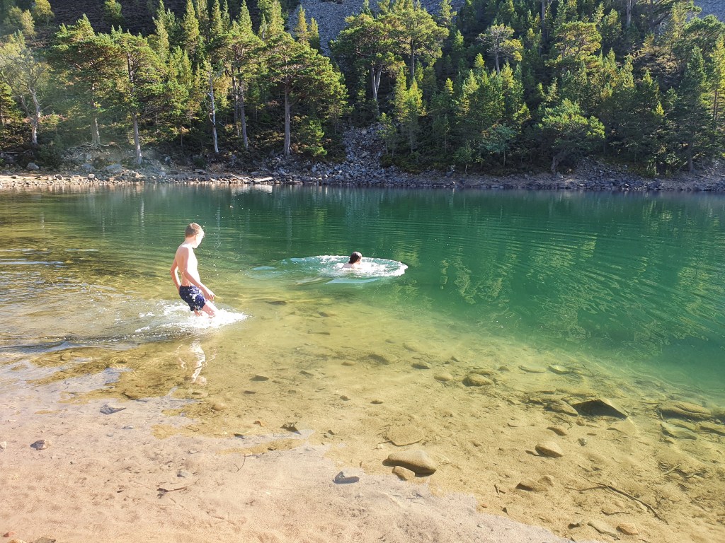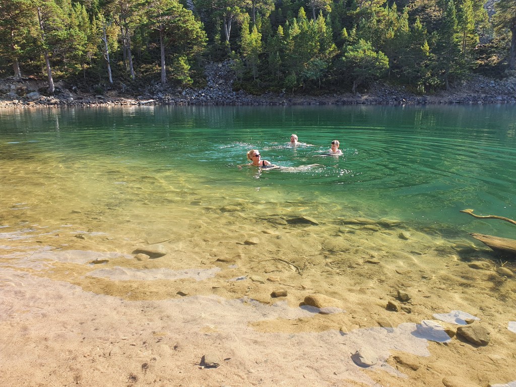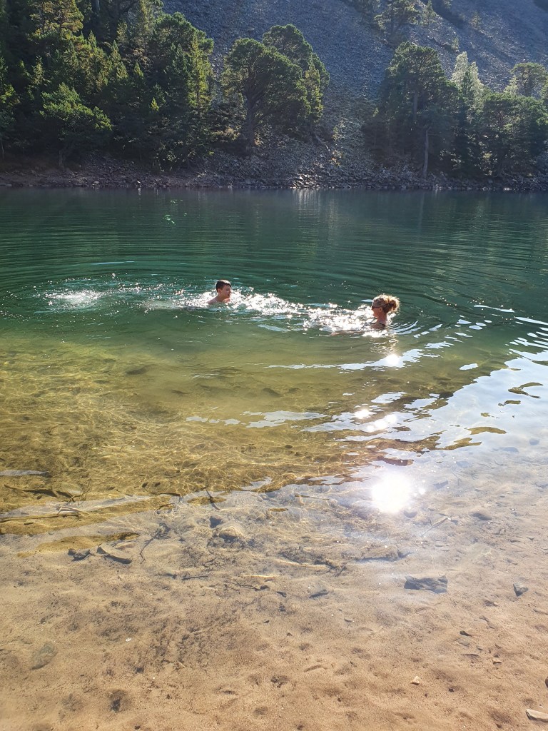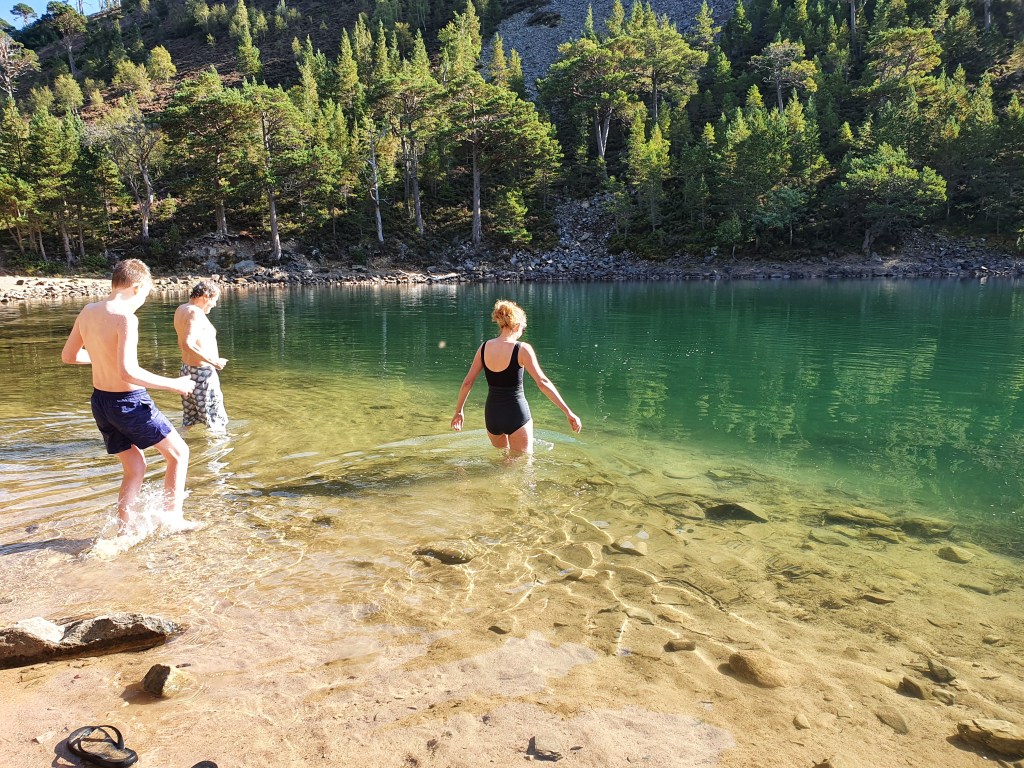 I managed to tick swimming in An Lochan Uaine (green loch) off my bucket list today. It’s an emerald-coloured lochan with a sandy beach about 5 miles from Aviemore. It’s so inviting that even Daniel and Ben ventured into the water, despite the frigid temperature. I’m not sure what the temperature was exactly but it was definitely much colder than the River Dee. Ben said it nearly froze his balls off.