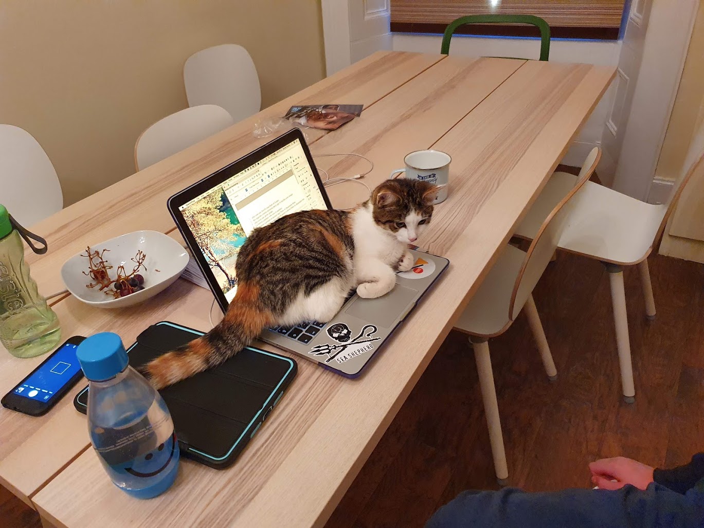 They say dogs have owners but cats have staff. That is so true. Here she is derailing Daniel’s efforts to do his homework at the Airbnb last weekend.