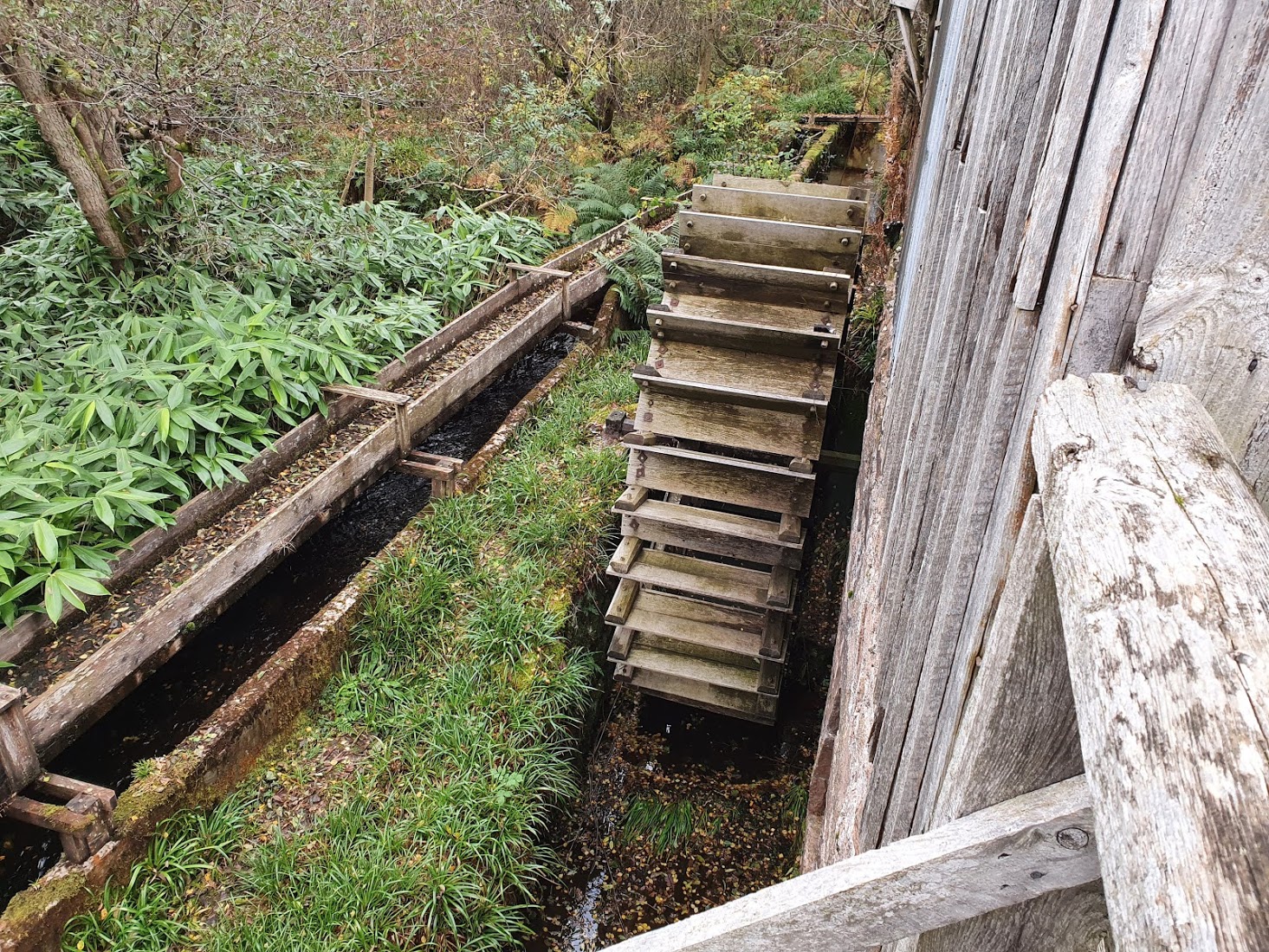 Eventually the path rejoins the access road but before heading back to the main sawmill you can take a right turn across a wooden bridge and follow the stream up to the bucket mill.