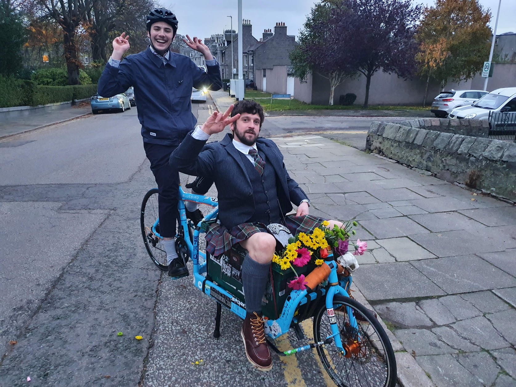 We went for a lovely dinner at Foodstory tonight. We’re not allowed to have people in our homes but we can meet people from another household at a restaurant provided our number is not more than 6 (this excludes children under 12). On the way there we met a couple of people with a cargo bike and they let me take this photo. I think the guy with the kilt is wearing it in the traditional way because he was quite concerned with his skirt when climbing in and out of the bike.