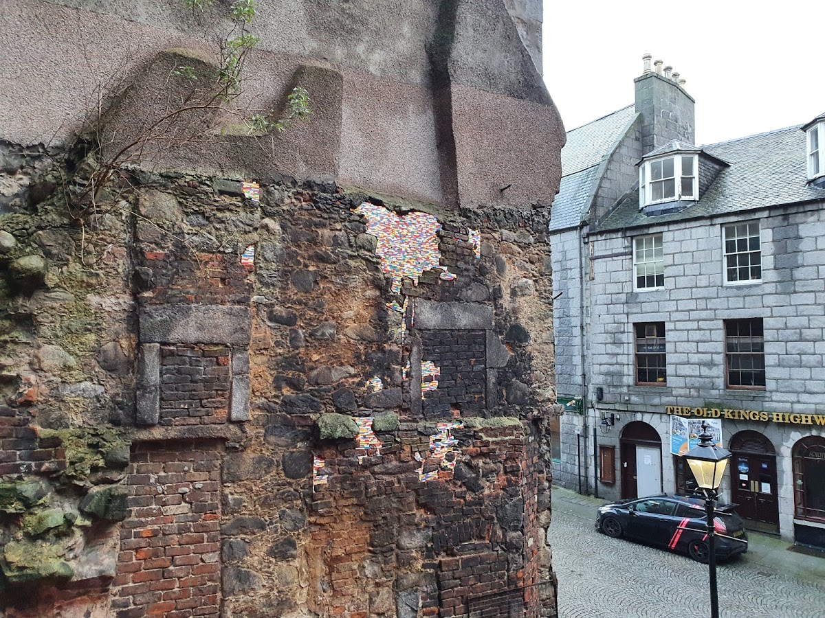 I was walking around central Aberdeen today and found this crumbly building that had been patched up with lego bricks. Those colored bits are lego.