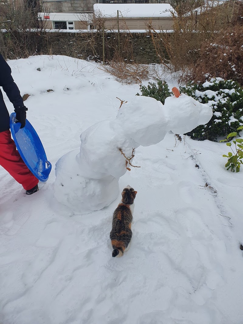 Daniel’s snowman looks like she participated in a limbo competition and is now stuck permanently on a lean. There’s some weird physics going on here to prevent her from collapsing over. The cat is wondering whether to attack her arms.