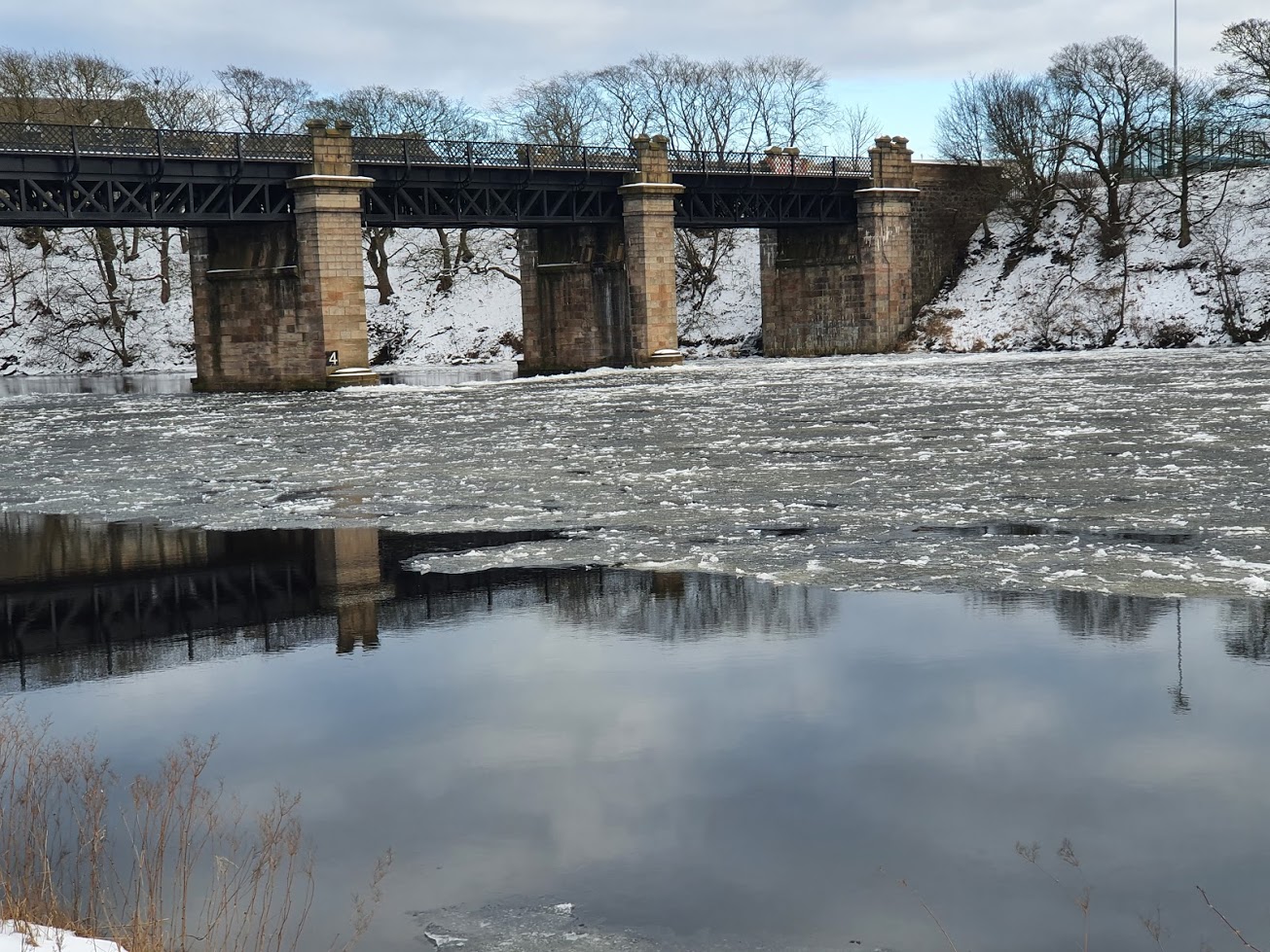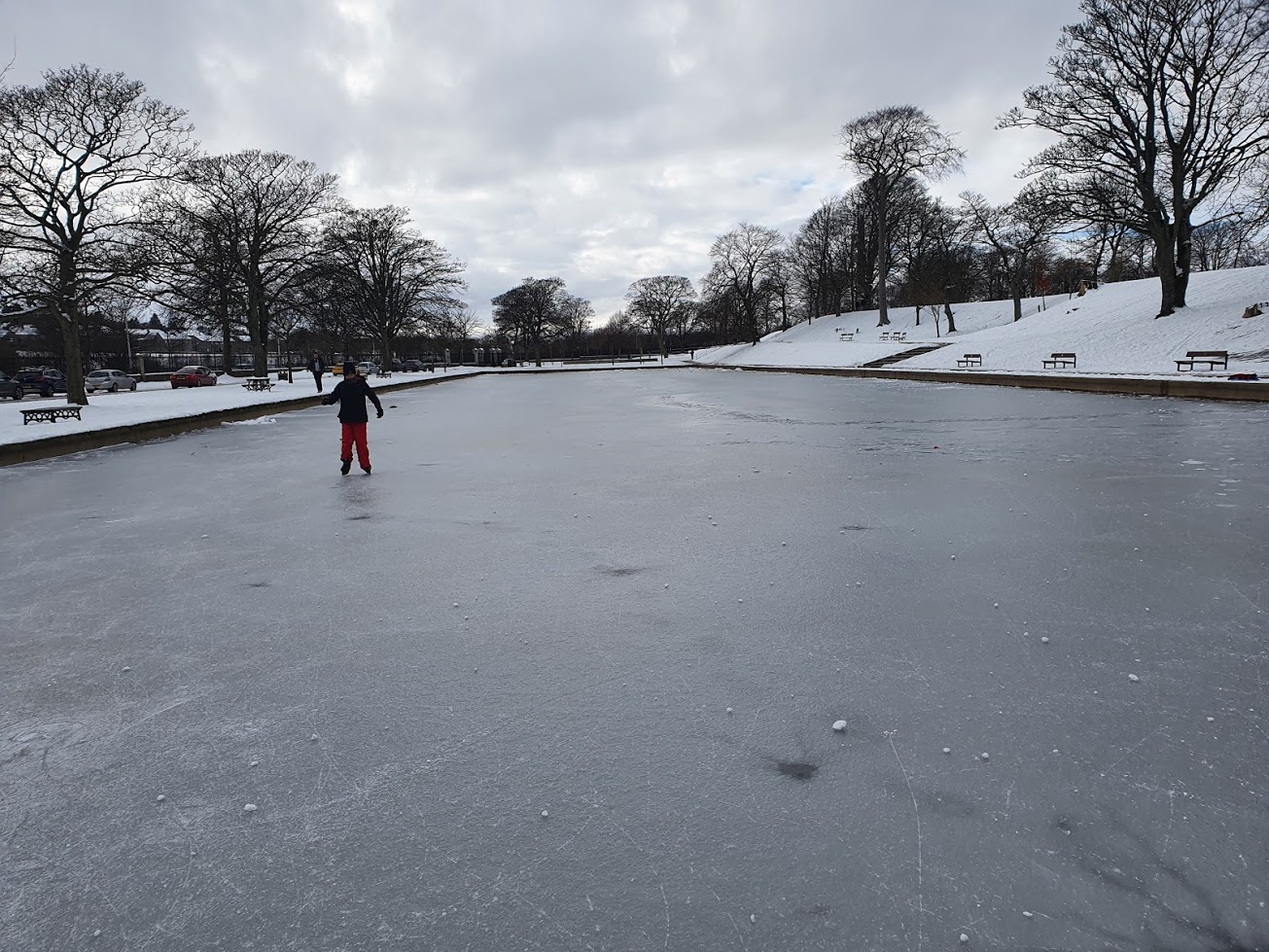 Yesterday was skiing on Deeside Way and today was ice-skating at Duthie Park. I feel like I’m living at an alpine sports village. It was -8C last night and the model boating pond at Duthie Park froze. Daniel, Scott, and I went down for a skate at lunch.