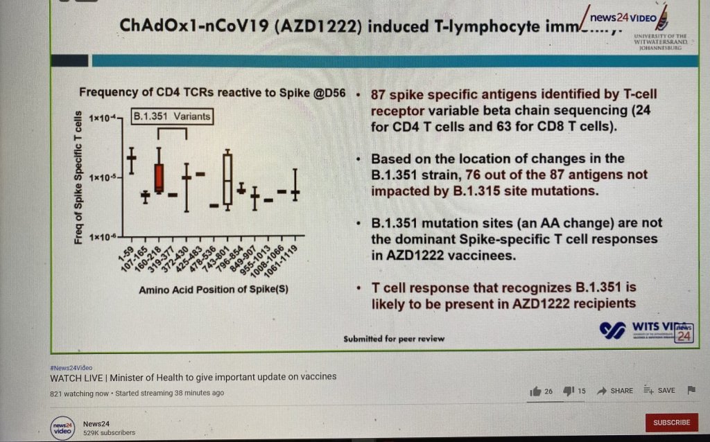 This is the image in a larger version. The last bullet point is the crucial point. It says the T-cell response that recognises the South African variant is likely to be present in individuals who have had the AstraZeneca vaccine.